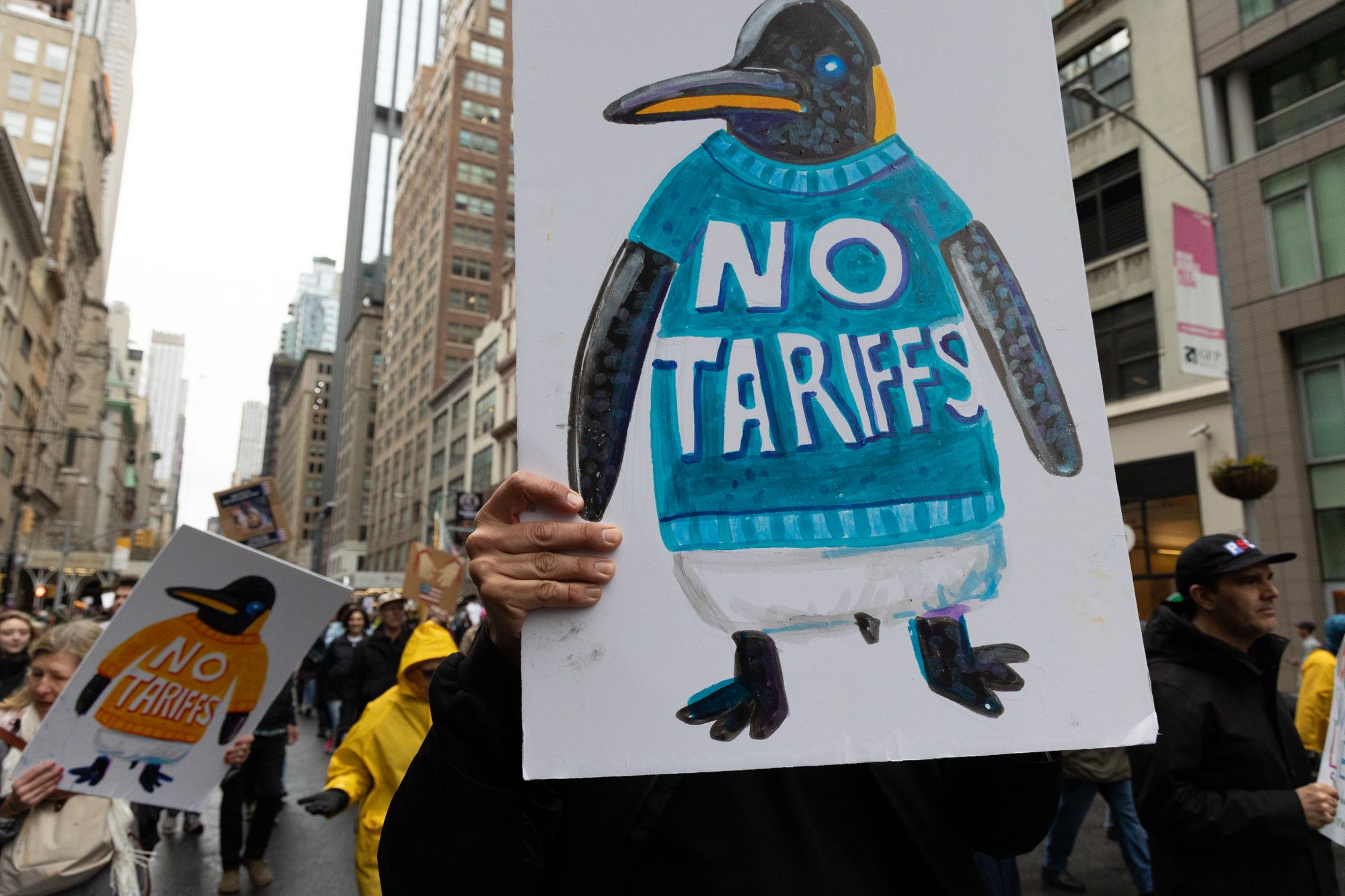 Gina M Randazzo / ZUMA Press Wire / Scanpix / LETA Протестующие призывают Трампа отменить тарифы, которые он ввел 2 апреля. Изображение на плакате отсылает к необитаемому архипелагу в Индийском океане, состоящему из острова Херд и островов Макдональд. Эти территории тоже обложили тарифами, хотя на них обитают в основном пингвины. 5 апреля 2025 года