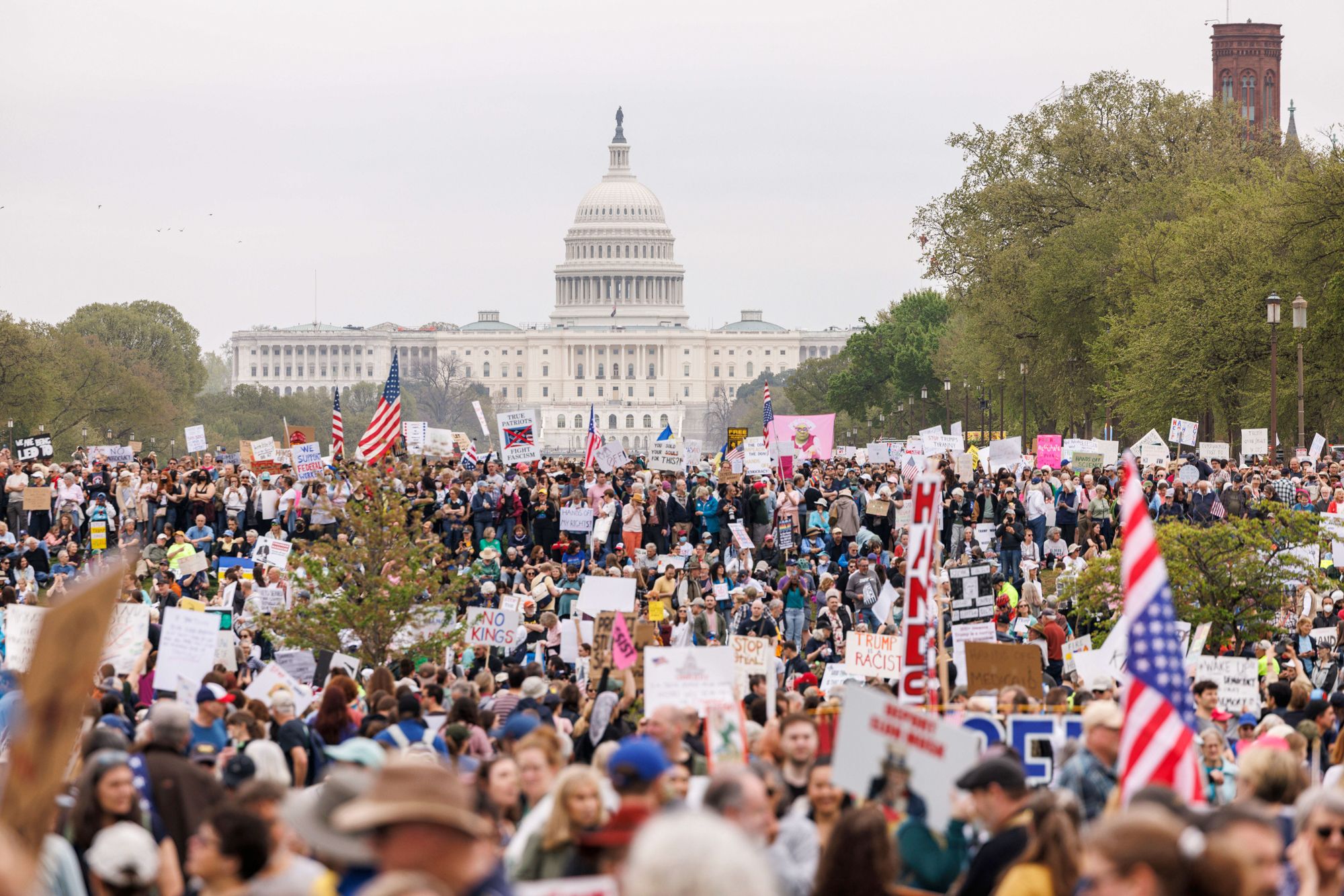 Aaron Schwartz / Bloomberg / Getty Images Участники протеста на Национальной аллее в Вашингтоне. 5 апреля 2025 года