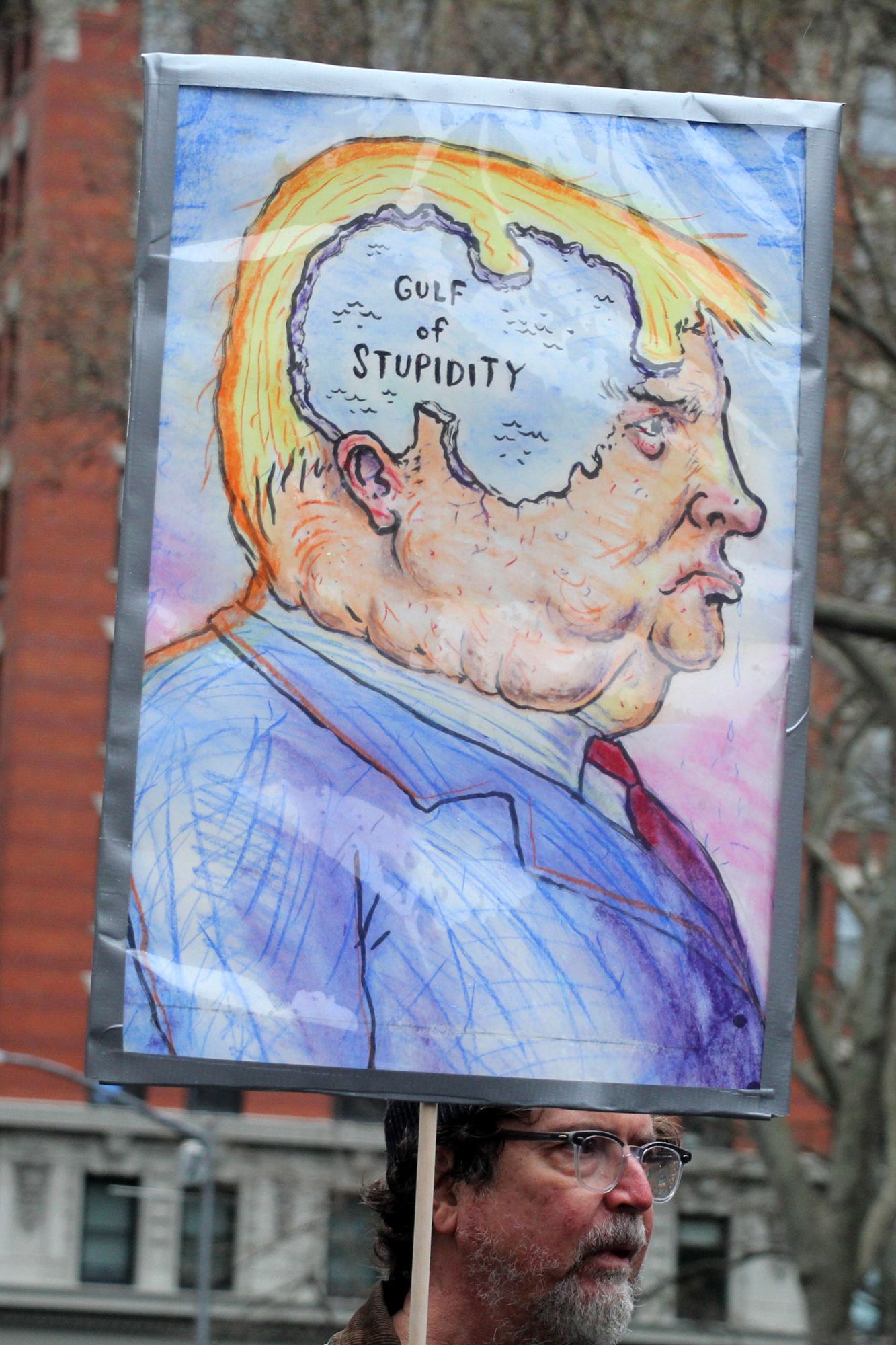 Emily Cotler / ZUMA Press Wire / Scanpix / LETA Протестующий в Нью-Йорке с плакатом «Залив глупости» — отсылка к переименованию Мексиканского залива в Американский. 5 апреля 2025 года