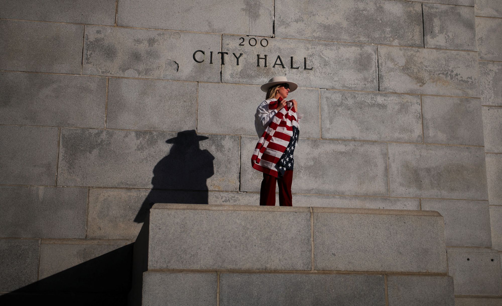 REUTERS/Daniel Cole Участница митинга «Руки прочь!» с флагом США. 5 апреля 2025 года
