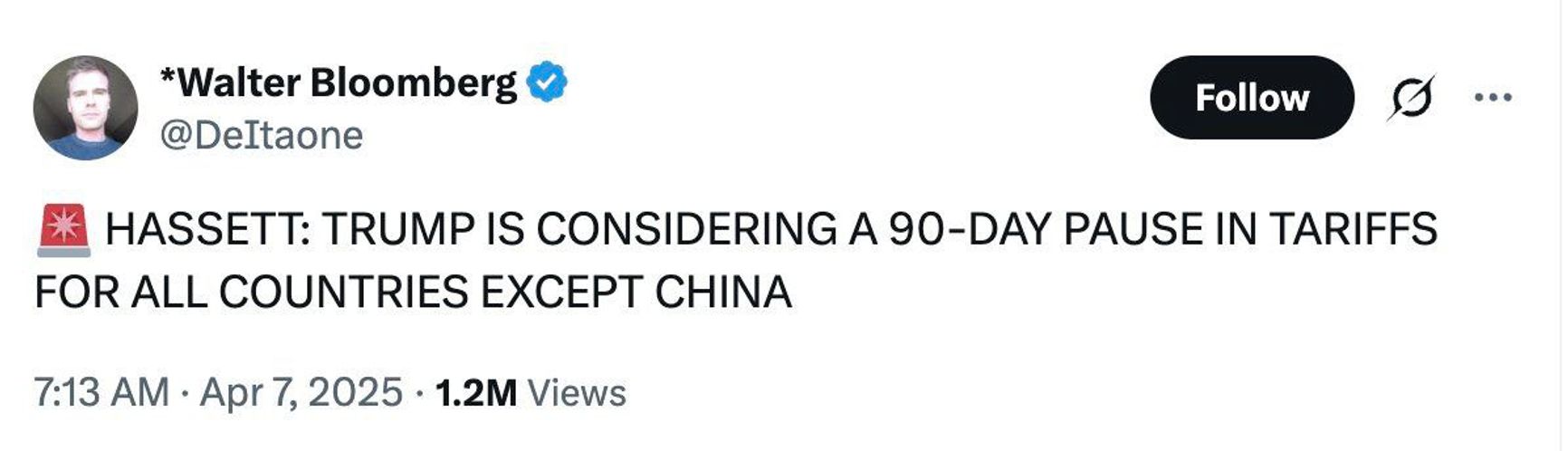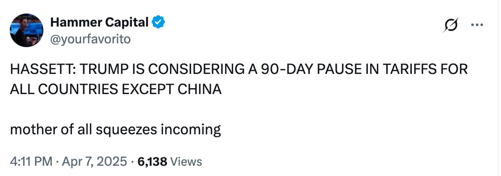 Аккаунт в X Hammer Capital (около 600 подписчиков) публикует сообщение: «Хассет: Трамп рассматривает возможность 90-дневной паузы в введении тарифов для всех стран, кроме Китая. Грядет мать всех шорт-сквизов».