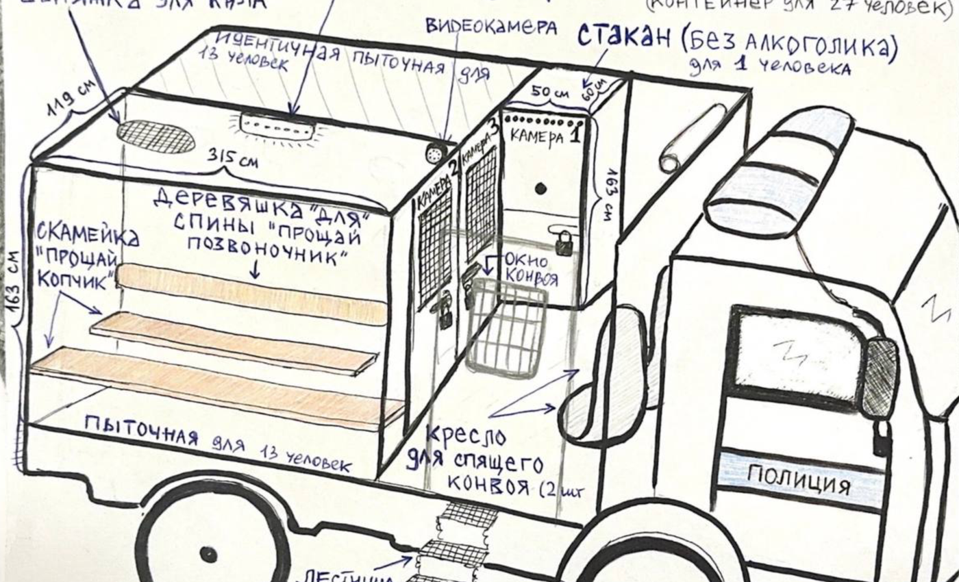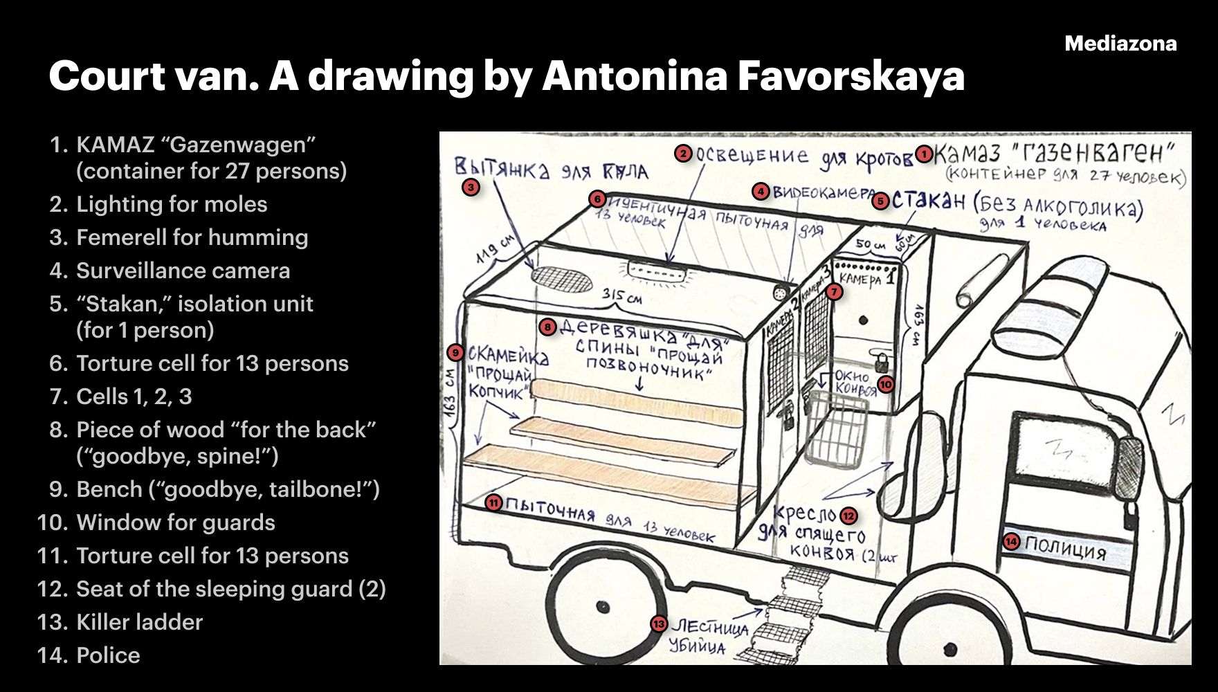 Her lawyer, Yevgeniya Grigoryeva, compared the isolation unit inside the transport vehicle (a small enclosure known as stakan, or “the glass”) to the dimensions of a coffin. She asked the court to accept into evidence a drawing by Favorskaya titled Kamaz-Gazenwagen, a reference to the Nazi-era gas trucks. Favorskaya explained that the vehicle has no seatbelts or handrails, which means detainees are thrown from side to side during any movement. Along one wall of the vehicle, there is a bar that prevents them from resting their backs properly.