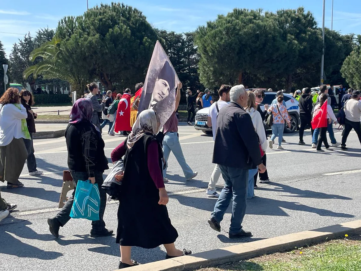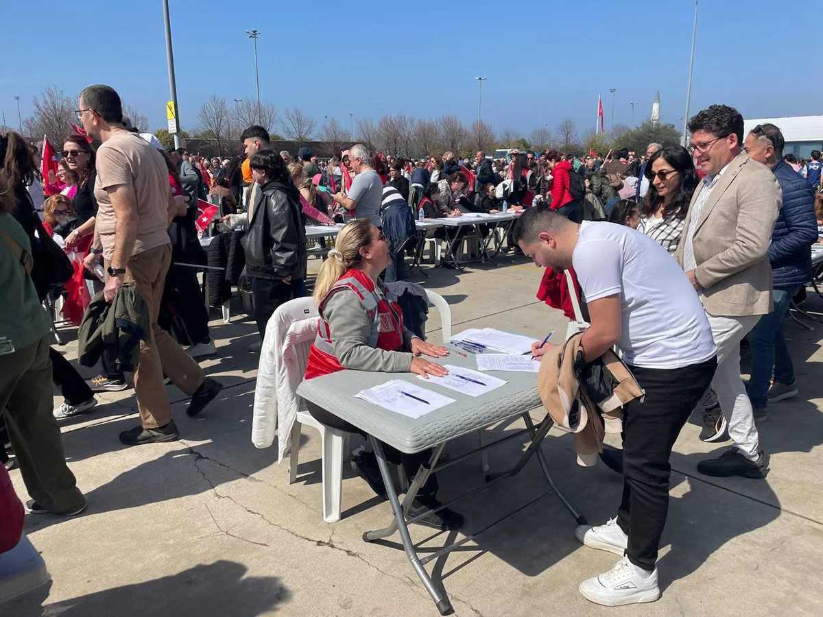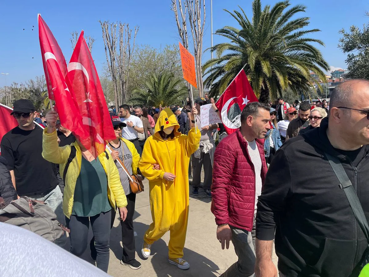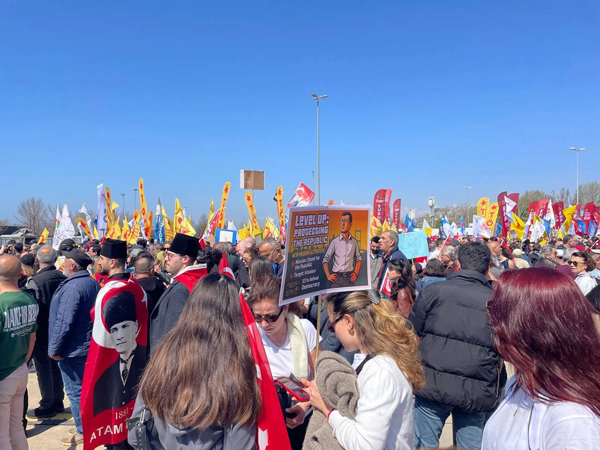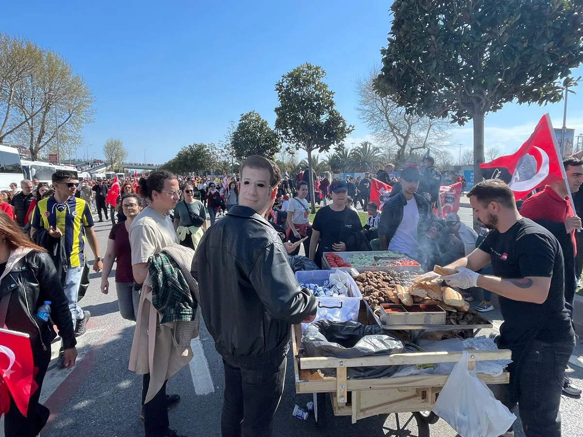 Уже в 10 утра около станций Мармарая (электричка, связывающая центр Стамбула с азиатской частью) продавали красные флаги Турции с портретом Ататюрка, а вагоны были полны людей, уже купивших их или захвативших полотнище из дома. На выходе из ближайшей к месту проведения митинга станции началась давка: протестующие пели песни и скандировали лозунги вроде «Пра-во, за-кон, спра-вед-ли-вость». Тут же продавали бумажные маски Имамоглу: веревочки для ушей есть, глаза вырезать нужно самому.