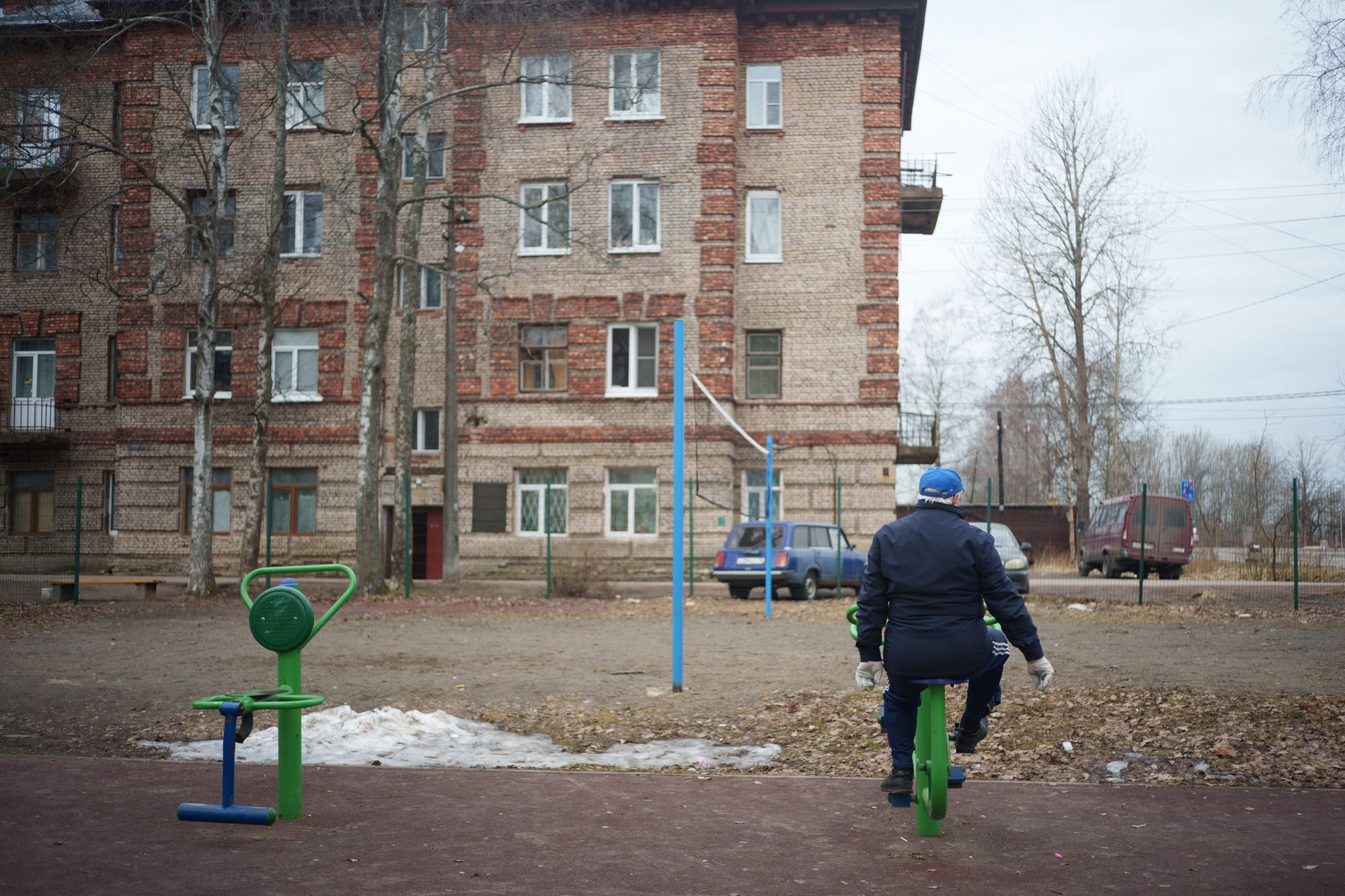В полдень буднего дня в Осельках можно встретить только пожилых людей: одни сидят на лавочках возле своих подъездов, другие — делают зарядку на детских площадках. Среди активных пенсионеров — Николай. Не отрываясь от упражнений, мужчина рассказывает: раньше он служил в военной части, заброшенные казармы которой спрятались в лесу неподалеку.