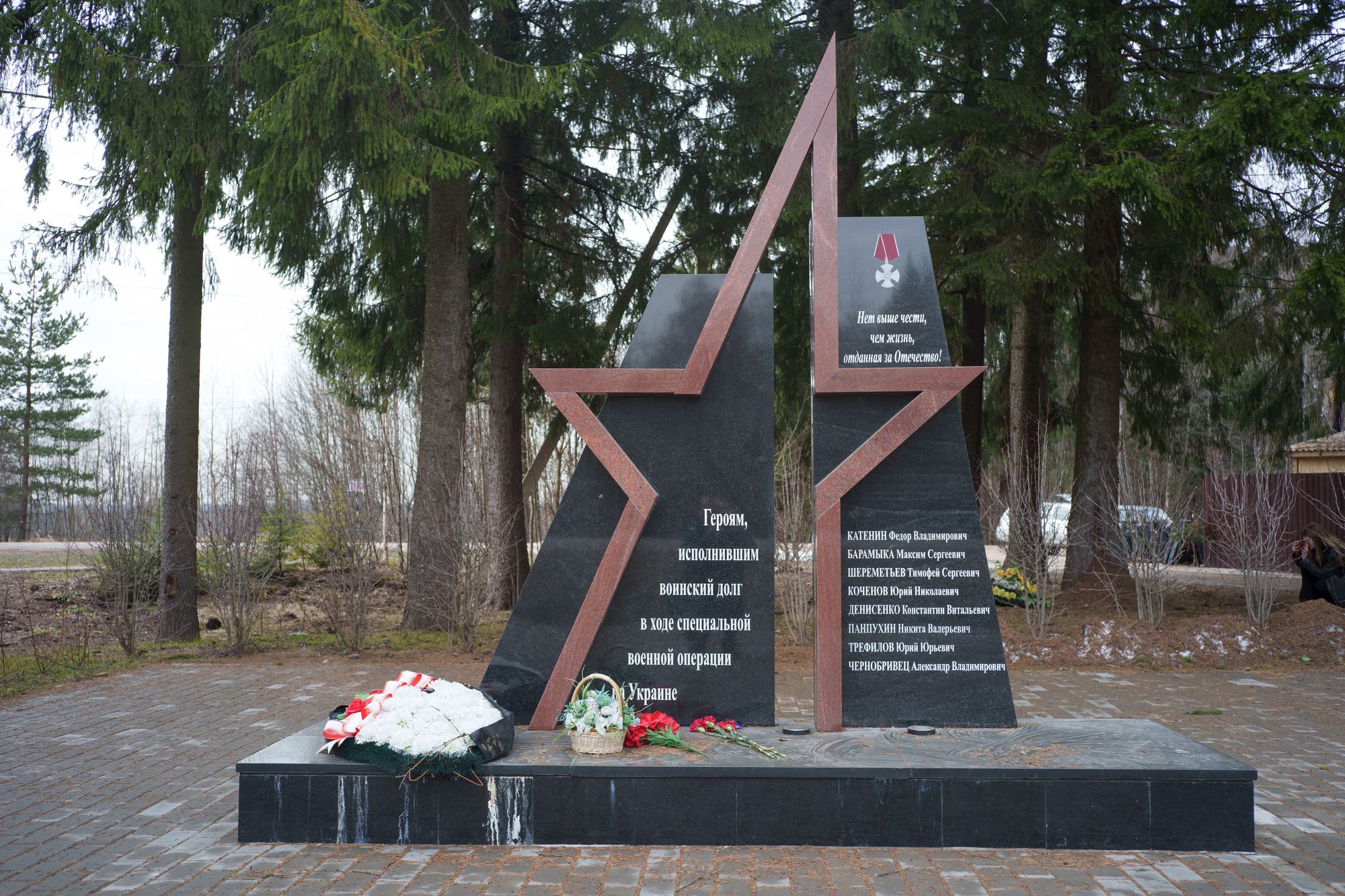 На въезде в поселок, прямо перед кладбищем, стоит часовня и заваленный цветами памятник «героям, исполнившим воинский долг в ходе специальной военной операции на Украине». Его торжественно открыли в сентябре 2024 года. На памятнике сразу выбили пять имен погибших участников войны из Лесколовского сельского поселения, куда входят Осельки и еще десяток населенных пунктов. Но на монументе оставили свободное место для новых «героев» — к марту 2025-го там указано уже восемь человек. Скоро должны выгравировать и имя Алексея Гажука.