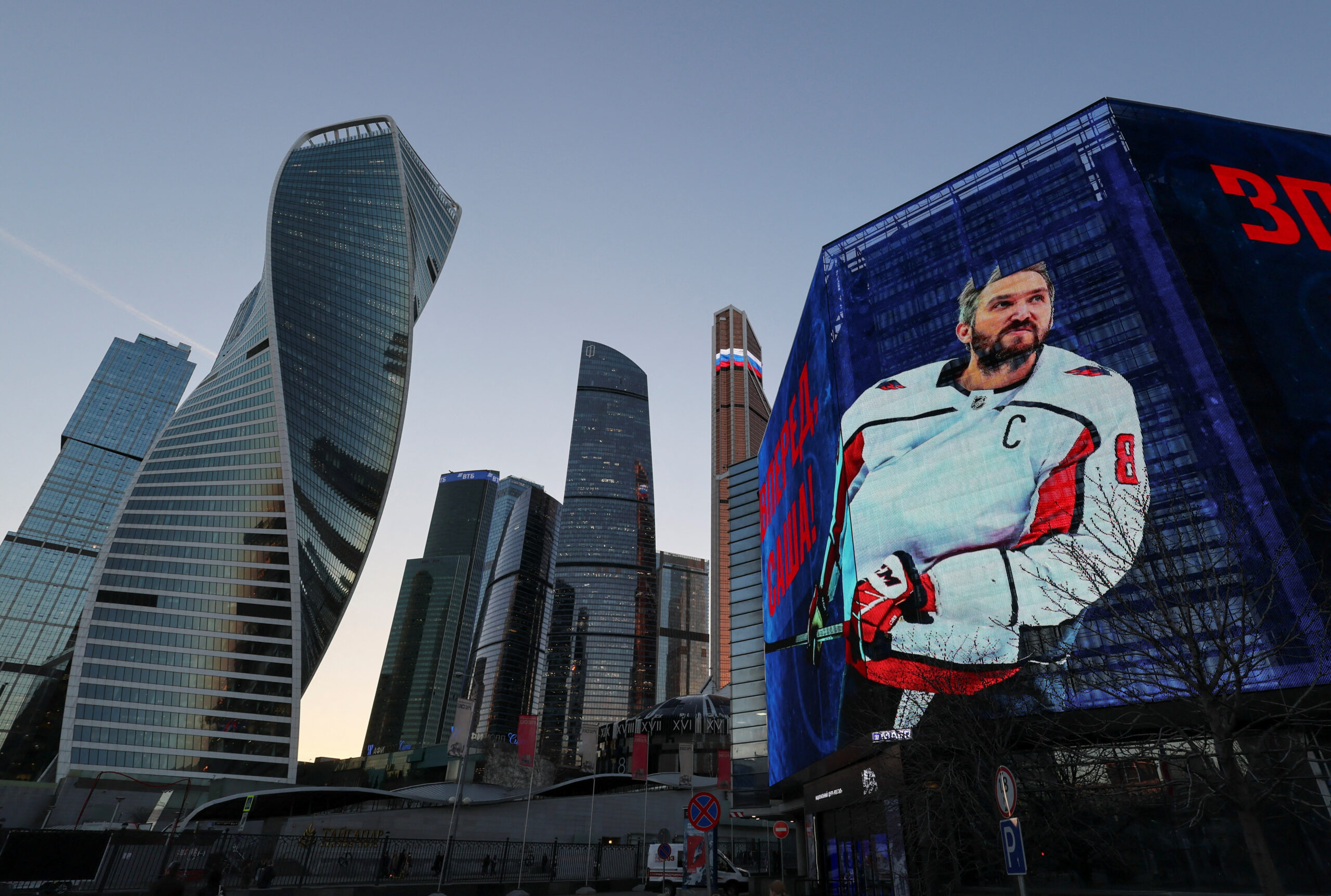 Фото: Александр Овечкин, капитан команды Национальной хоккейной лиги «Вашингтон Кэпиталз», на экране рядом с Московским международным деловым центром «Москва-Сити», 3 апреля 2025 года. REUTERS/Shamil Zhumatov