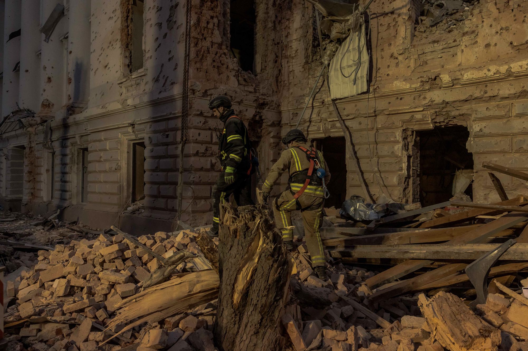 Российские войска 13 апреля, в Вербное воскресенье, нанесли ракетный удар по Сумам. Погибли, по последним данным, 34 человека, в числе которых двое детей. Пострадали не менее 119 человек. По городу, сообщил президент Украины Владимир Зеленский, ВС РФ выпустили две ракеты. Первая попала в одно из зданий университета, вторая разорвалась над улицей, рассказал Зеленский. «Только сволочь так может действовать. Забирая жизни у обычных людей», — подчеркнул он. «Россия снова принесла смерть», — заявили в Госполиции Украины, добавив, что 13 апреля стало «днем боли и черной скорби» для всей страны. «Медуза» публикует фотографии последствий ракетного удара по Сумам.