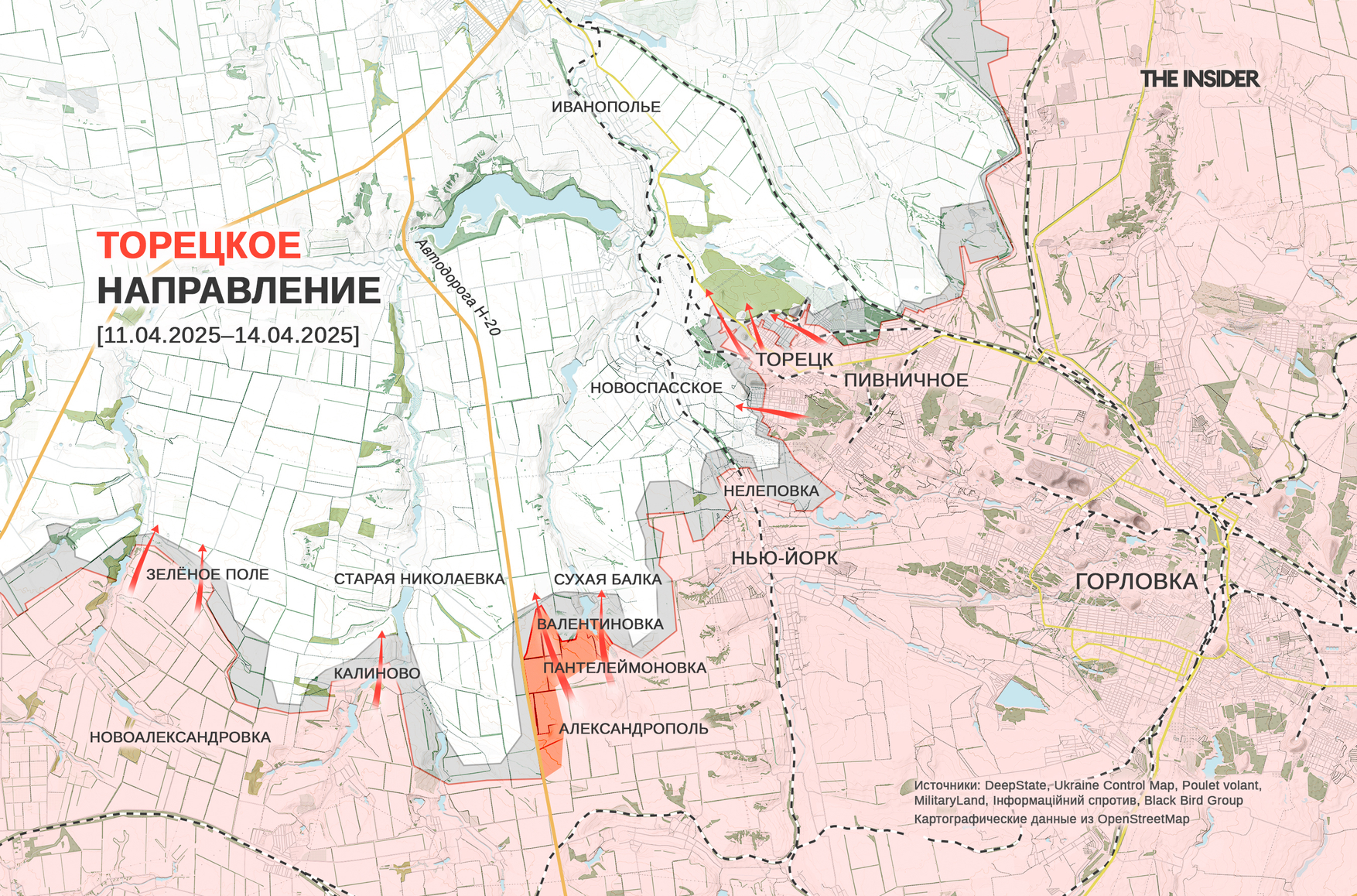 Юрий Котенок сообщает о прорыве россиян в Нелеповку и атаках к северу от Торецка. К западу от города, по информации Котенка, ВС РФ пытаются ликвидировать «карман» между Нью-Йорком (в 1955–2021 годах — Новгородское) и Зелёным Полем, а также пробиться от ранее взятой Пантелеймоновки к трассе на Константиновку.