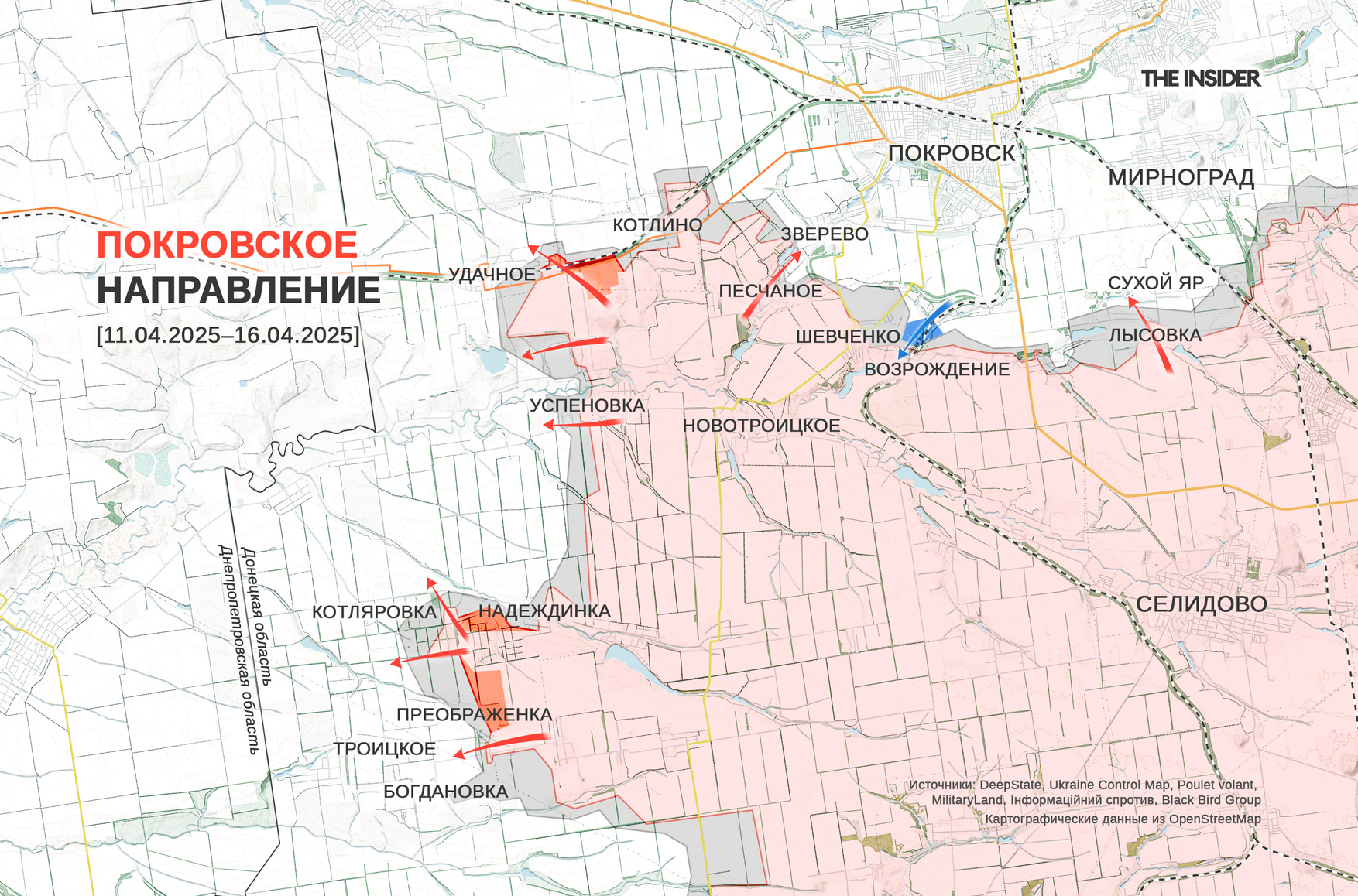 DeepState сообщает о продвижении ВС РФ около Надеждинки и Сухой Балки к юго-западу от Покровска. ВСУ, в свою очередь, отбили позиции возле Возрождения рядом с Шевченко, непосредственно под Покровском.
