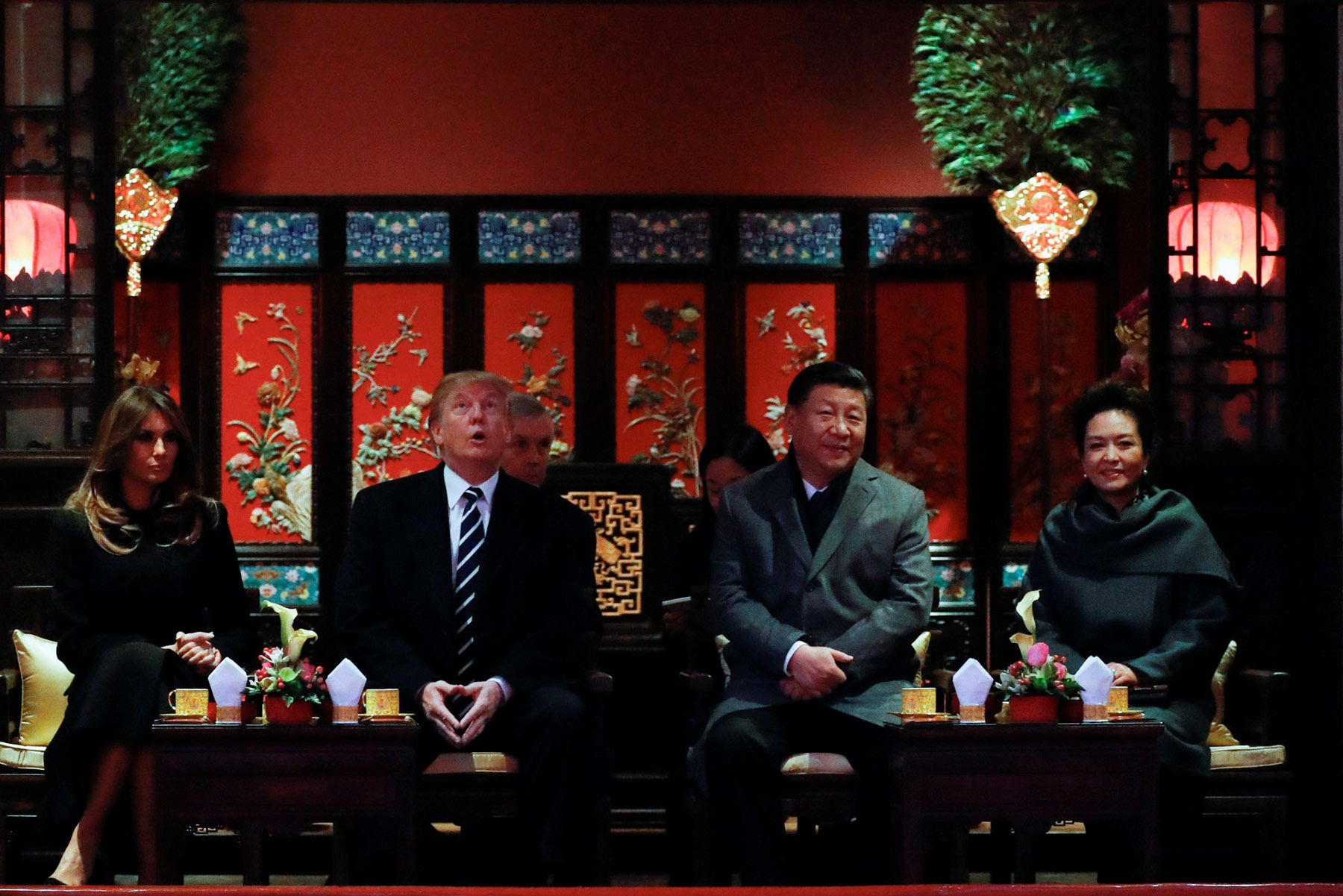 Jonathan Ernst / Reuters / Scanpix / LETA Президент США Дональд Трамп, американская первая леди Мелания Трамп, глава КНР Си Цзиньпин и его супруга Пэн Лиюань смотрят оперу в Пекине. Ноябрь 2018 года