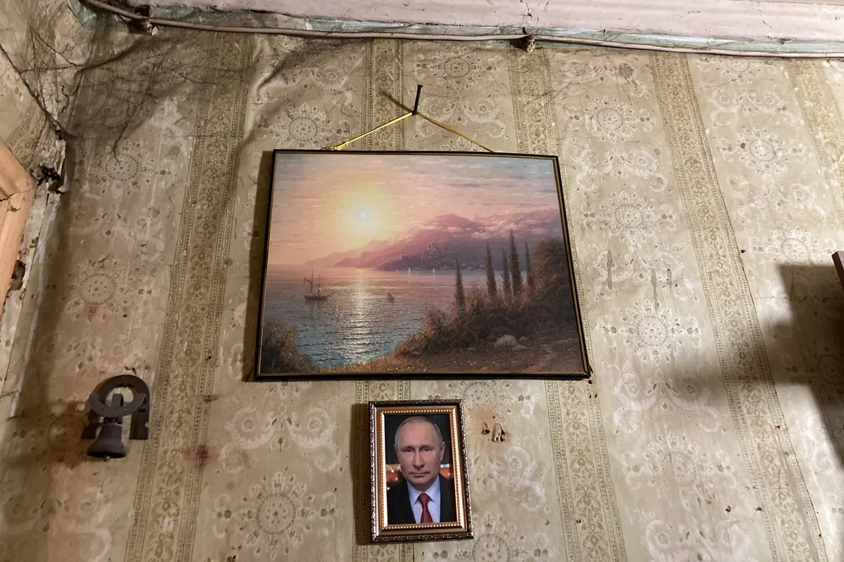 A fly swatter and a flag in the shape of the letter Z hang in Yelena Anatolyevna’s hallway, something she takes to the pro-war events she attends. There is a pretty picture hung on a nail on the wall, and underneath that, in a gilded frame, a portrait of Vladimir Putin, reminiscent of an icon.