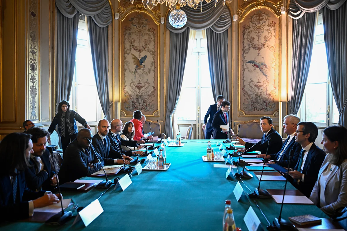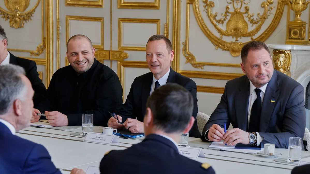 Дипломатический советник президента Франции Эммануэль Бонн (в центре), руководитель Офиса президента Украины Андрей Ермак (справа) и министр обороны Украины Рустем Умеров (в центре слева) на встрече с делегациями США, Германии и Великобритании в Париже, 17 апреля 2025 года. Фото: Ludovic Marin / AP Photo / Scanpix / LETA
