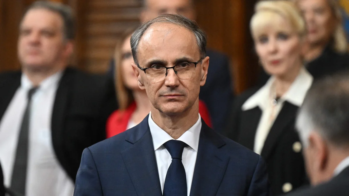 Новоназначенный премьер-министр Сербии Джуро Мацут принимает участие в церемонии присяги нового правительства Сербии в Белграде 16 апреля 2025 года. Фото: Oliver Bunic / AFP / Scanpix / LETA