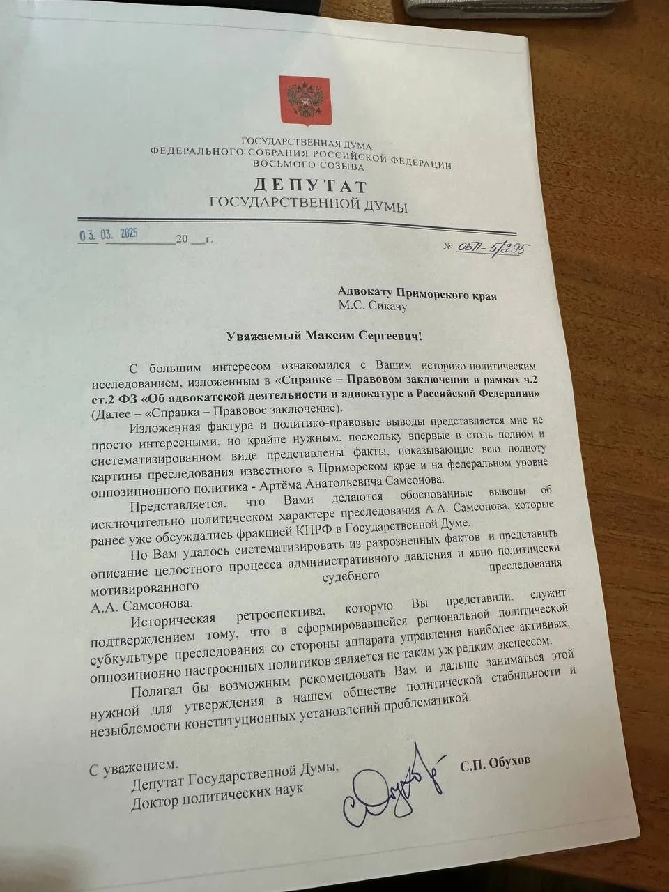 — Также мы приобщили все обращения, которые он успел направить как депутат Заксобрания, с сентября 2021 года (то есть с момента выборов) до ареста. Там была длительная переписка со Следственным комитетом по Приморскому краю и лично с [тогдашним начальником ведомства] Владимиром Фоминым, который лично подписывал и утверждал постановление о возбуждении уголовного дела против Самсонова, — отмечает Максим Сикач.
