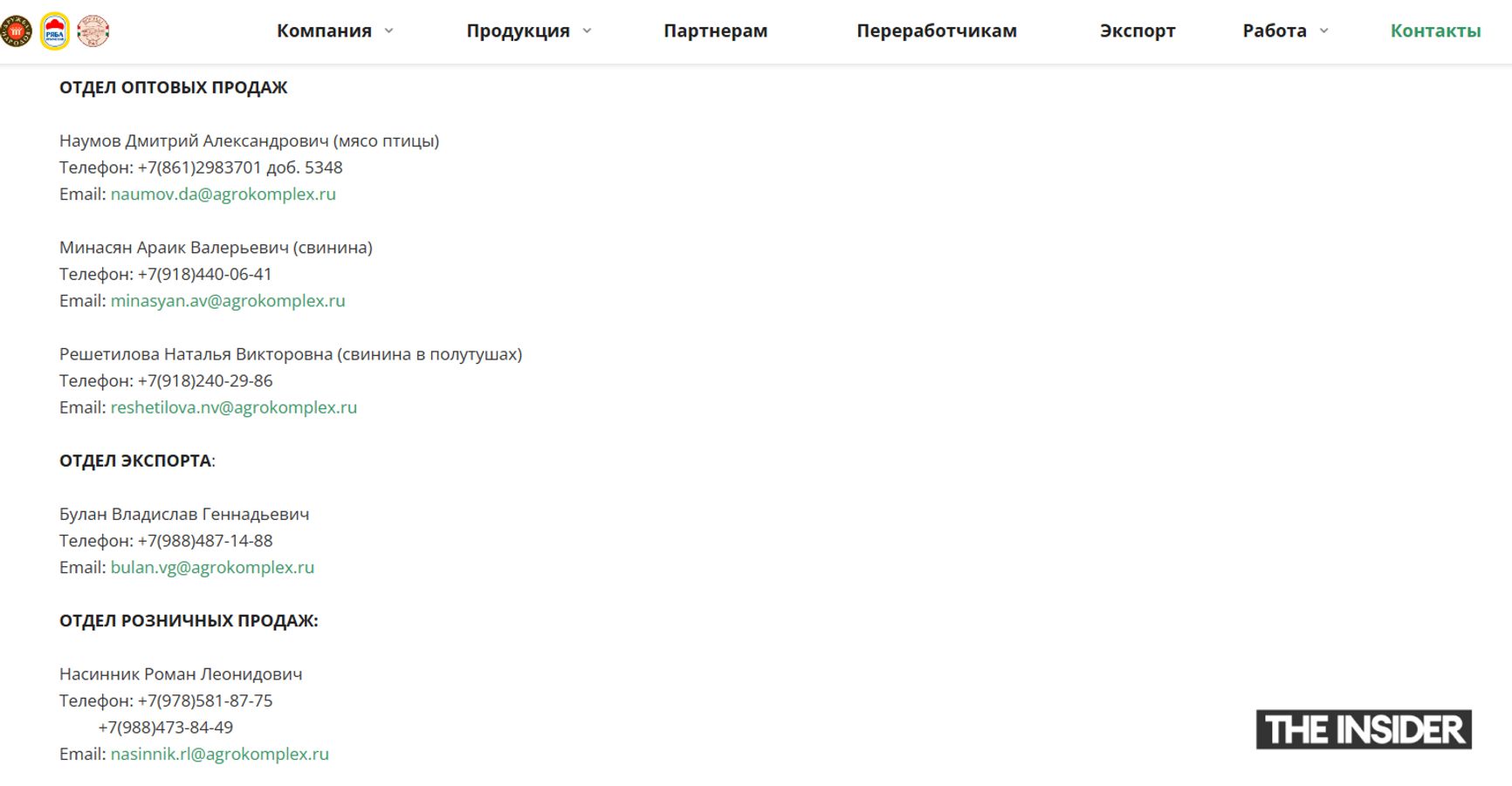 Кроме того, как обратил внимание The Insider, на сайте «Дружбы народов» в разделе «Контакты» все электронные адреса оканчиваются на «agrokomplex.ru». Если вбить этот домен в поисковик, то он предложит именно сайт «Агрокомплекса» Ткачёва.
