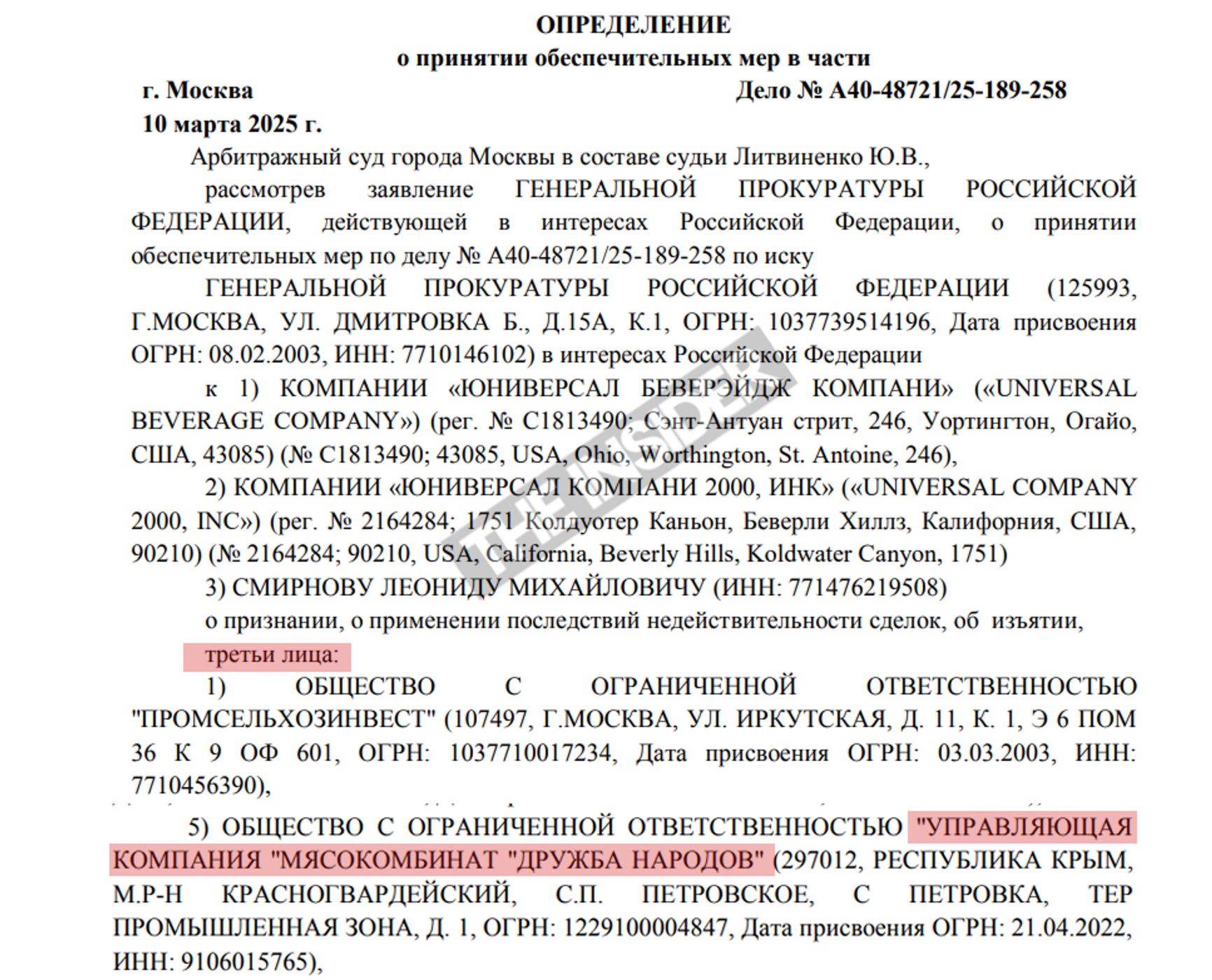 В начале марта Генпрокуратура подала иск к американской материнской компании «Главпродукта» — Universal Beverage Company бизнесмена Леонида Смирнова. Ведомство обвиняет руководство фирмы в попытке заблокировать работу временной администрации и вывести деньги за границу. Как писал РБК со ссылкой на источники, речь шла о более чем 1,3 млрд рублей.
