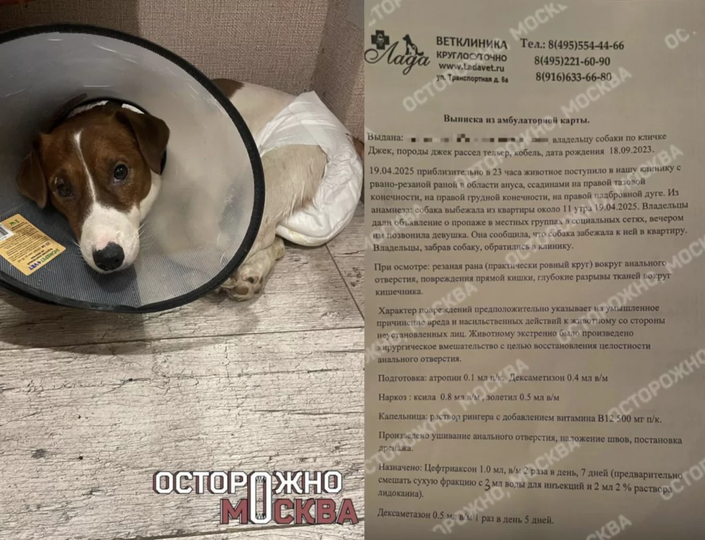 Хозяйка забрала животное и отвезла его в клинику «Лада». Там врачи подтвердили, что собаку изнасиловали, пишет «Осторожно, Москва». «Животное поступило в нашу клинику с рвано-резаной раной в области ануса, ссадинами на правой тазовой конечности, на правой надбровной дуге», — сказано в выписке. В документе отмечается, что собаке диагностировали повреждение прямой кишки и глубокие разрывы тканей вокруг кишечника.