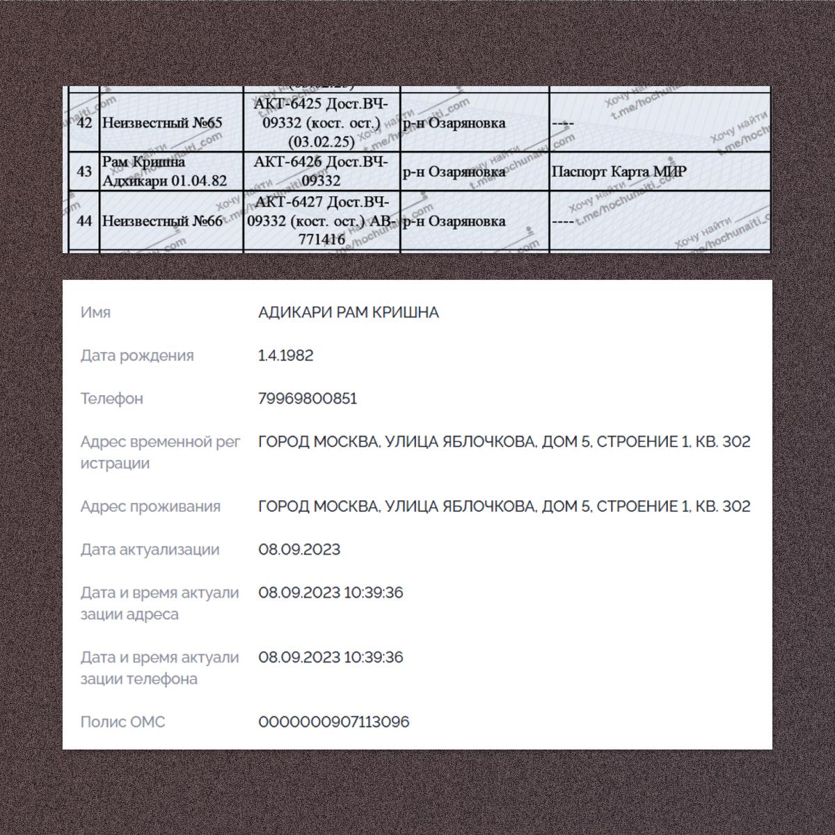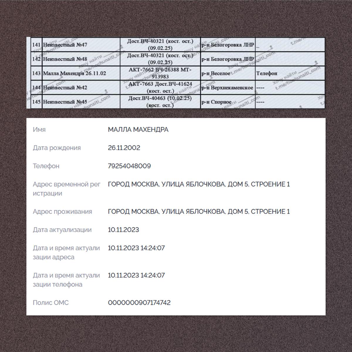 «Важные истории» сравнили список непальских добровольцев, приходивших в пункт отбора на Яблочкова, с другими утечками. Мы обнаружили двух непальцев, о смерти которых не сообщали местные СМИ — это 43-летний Рам Кришна Адхикари и 22-летний Махендра Малла. Их имена содержатся в документах, которые украинский проект «Хочу найти» называет списками эвакуированных тел и останков военнослужащих ВС РФ. Авторы телеграм-канала утверждают, что списки охватывают период с 1 по 14 февраля 2025 года.