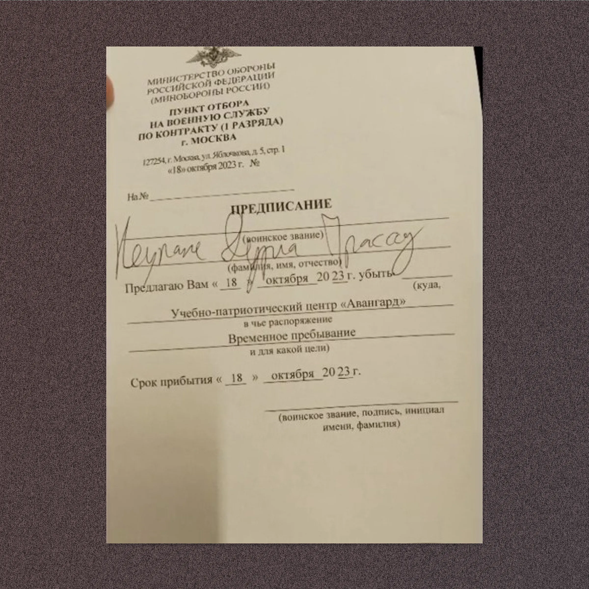 Such a document was posted by another Nepalese citizen — Durga Prasad Neupane. According to the EMIAS leak, the summons was issued on the same day he visited the center on Yablochkova Street. The very next day, October 19, the Nepalese man published a photo from Avangard in military uniform.