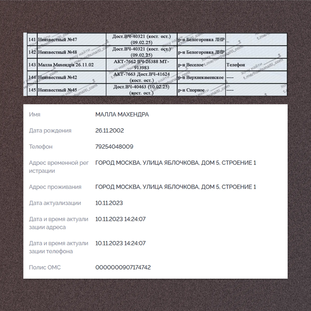 IStories compared the list of Nepalese volunteers who came to the recruitment center on Yablochkova Street with other leaks. We found two Nepalese whose deaths were not reported by local media — Ram Krishna Adhikari, 43 and Mahendra Malla, 22. Their names are contained in documents that the Ukrainian project Hochu Naiti [“I Want to Find”] calls lists of evacuated bodies and remains of Russian Armed Forces servicemen. The authors of the Telegram channel claim that the lists cover the period from February 1 to 14, 2025.