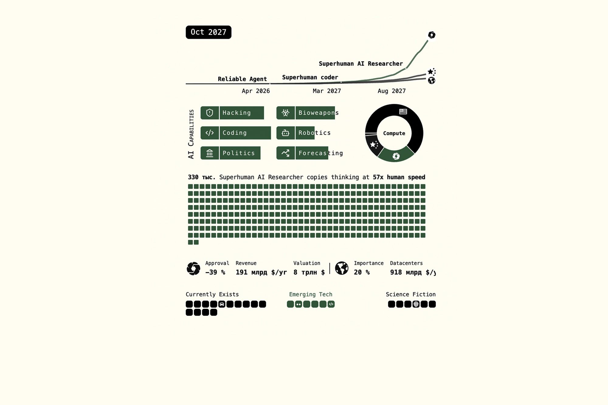 К июню 2027-го большая часть сотрудников OpenBrain уже не может вносить вклад в развитие искусственного интеллекта — он совершенствуется самостоятельно. А еще через месяц компания выпускает в публичный доступ Agent-3-mini, утверждая, что ей удалось создать AGI. Эта модель слабее Agent-3, но все равно превосходит всех существующих на рынке конкурентов. Наем программистов практически останавливается, а американские власти начинают всерьез задумываться над договором по контролю ИИ. Они опасаются, что искусственный интеллект может «сбежать» и поддержать потенциального противника.