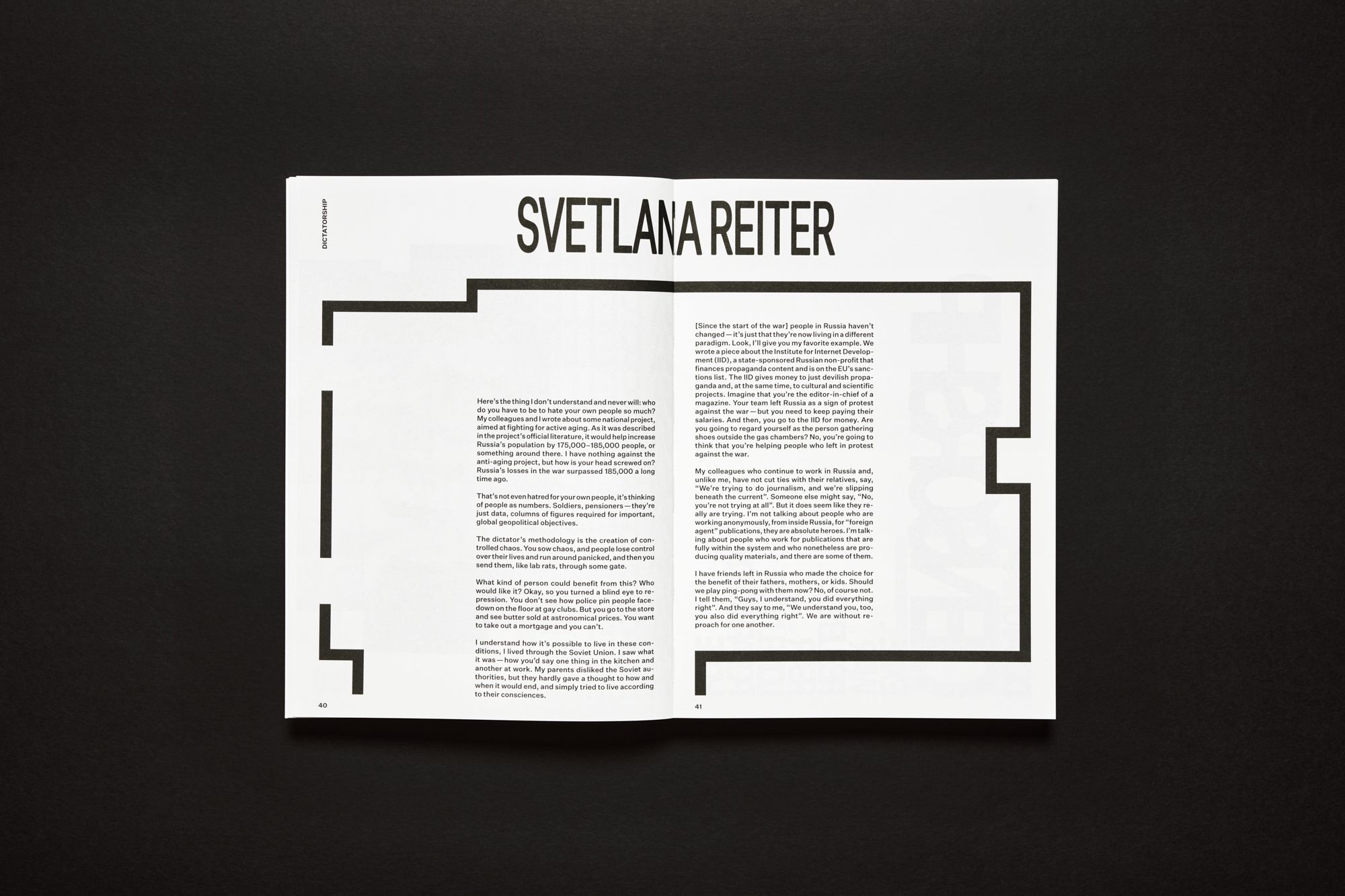 А еще мы публикуем монологи журналистов и друзей «Медузы», записанные драматургом Михаилом Дурненковым для документальной части проекта. Все они представлены в Kunstraum Kreuzberg в формате видео, но версии для выставки и для книги немного отличаются. Среди героев документальной части — кинокритик Антон Долин, издатель «Медузы» Галина Тимченко и фотограф Александр Гронский, который участвует в «No» еще и как художник (мы показываем снимки из его проекта «Moscow 2022-»).