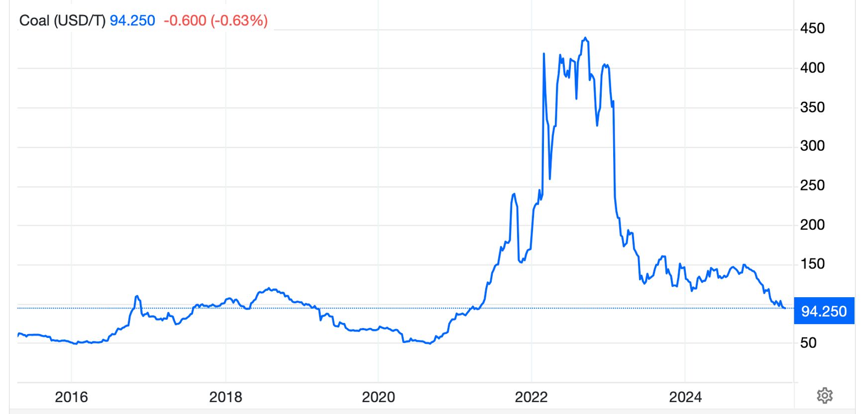 Если посмотреть на график цен на уголь, то вопросов, отчего российской угледобыче вдруг стало так плохо, не остается. В отдельные моменты 2023 года уголь стоил едва ли не $450 за тонну из-за энергетического кризиса в Европе. С такими ценами российским угольщикам было не страшно предоставлять огромные скидки своим восточным клиентам (до 50% относительно региональных бенчмарков).
