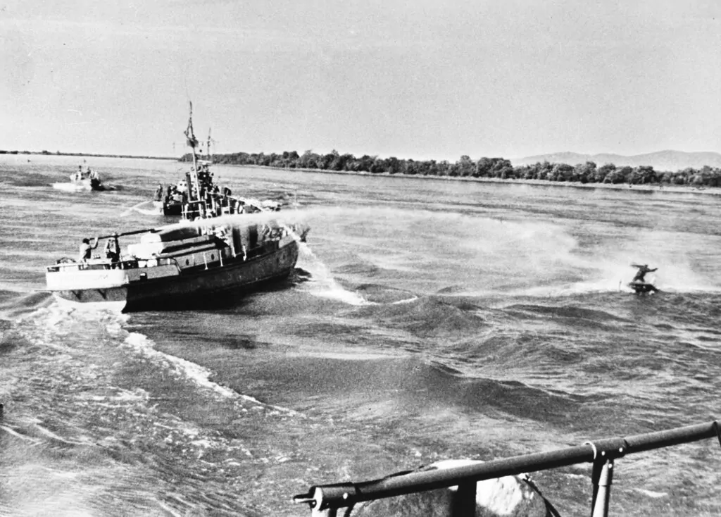 Советский корабль, использующий водомет против китайского рыбака на реке Уссури, 1969 год. Фото: China Photo Service / Dutch National Archives / Wikimedia Commons
