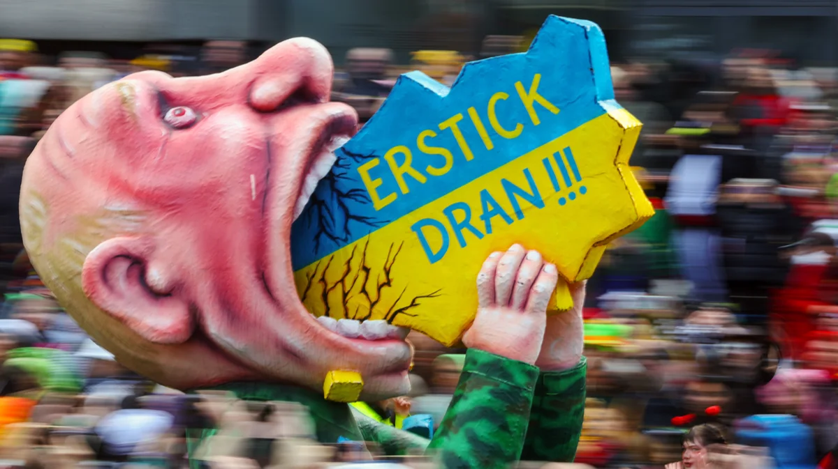 Карнавальная платформа с изображением Владимира Путина, Дюссельдорф, 12 февраля 2024 года. Фото: Christopher Neundorf / EPA