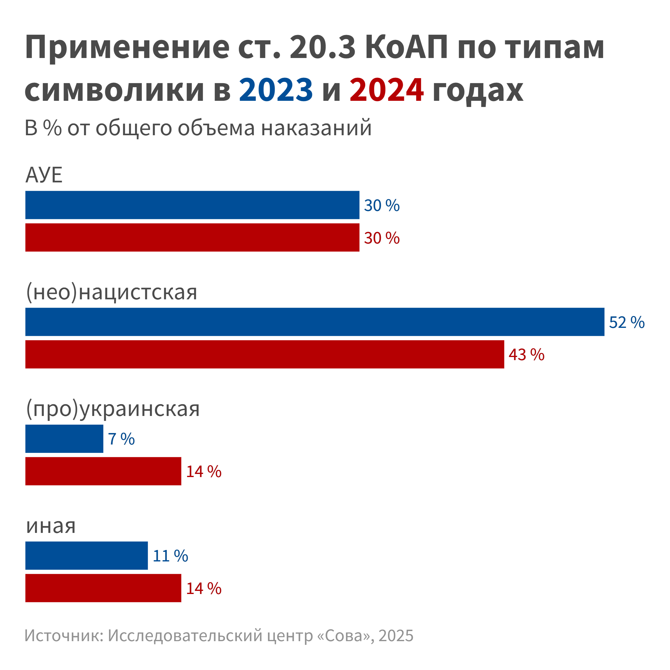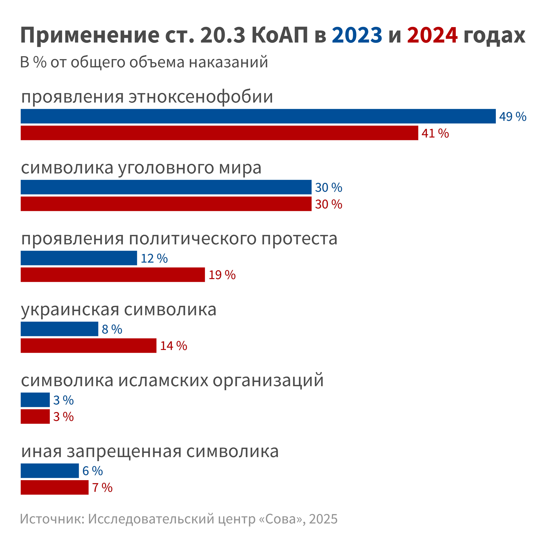 Судя по данным сайтов судов, лишь 0,7 % в 2023 году и 0,8 % решений в 2024 году было вынесено по ч. 2 ст. 20.3 КоАП по обвинению впроизводстве и/или сбыте запрещенной символики, в то время как подавляющее большинство — по ч. 1 ст. 20.3 КоАП о ее публичном демонстрировании.