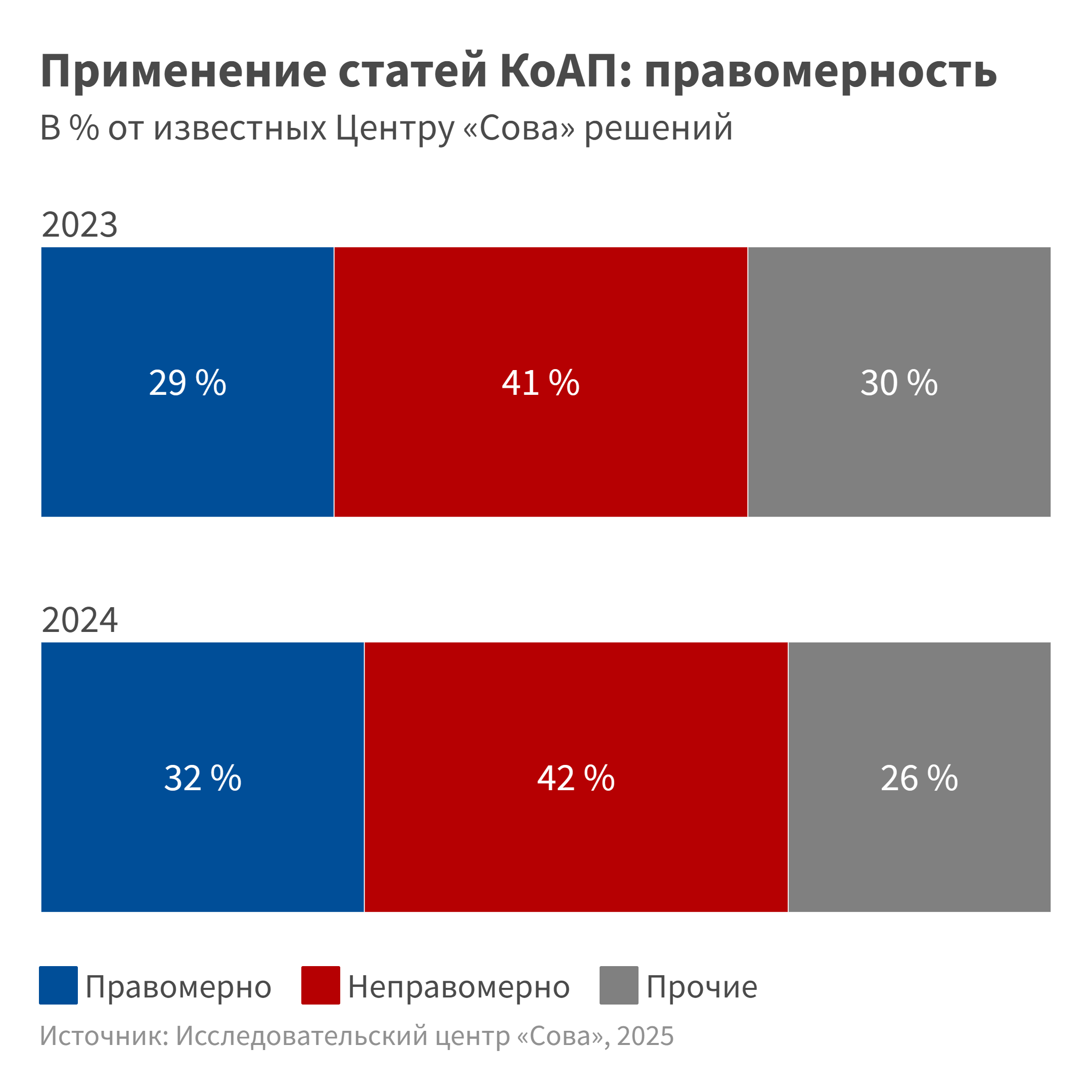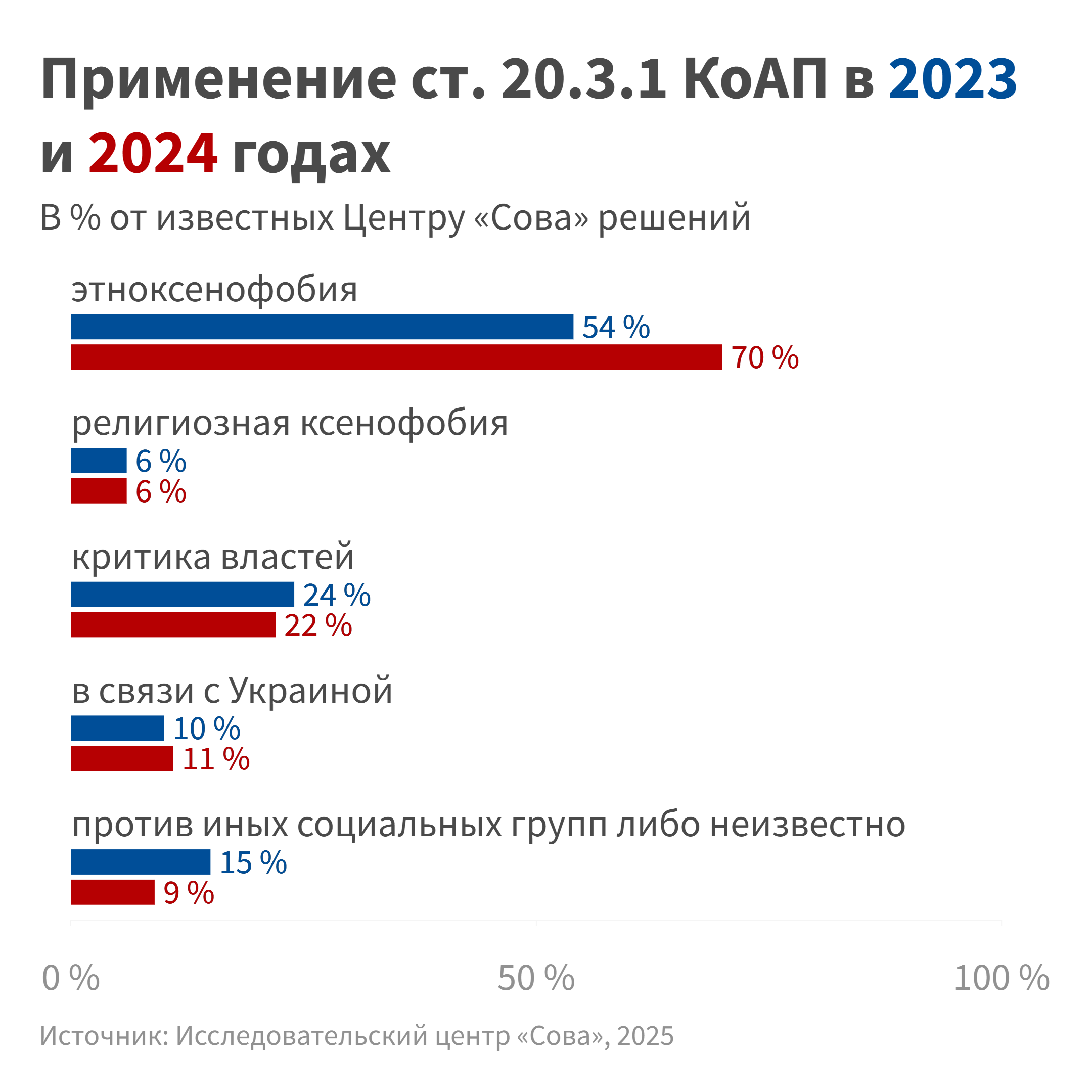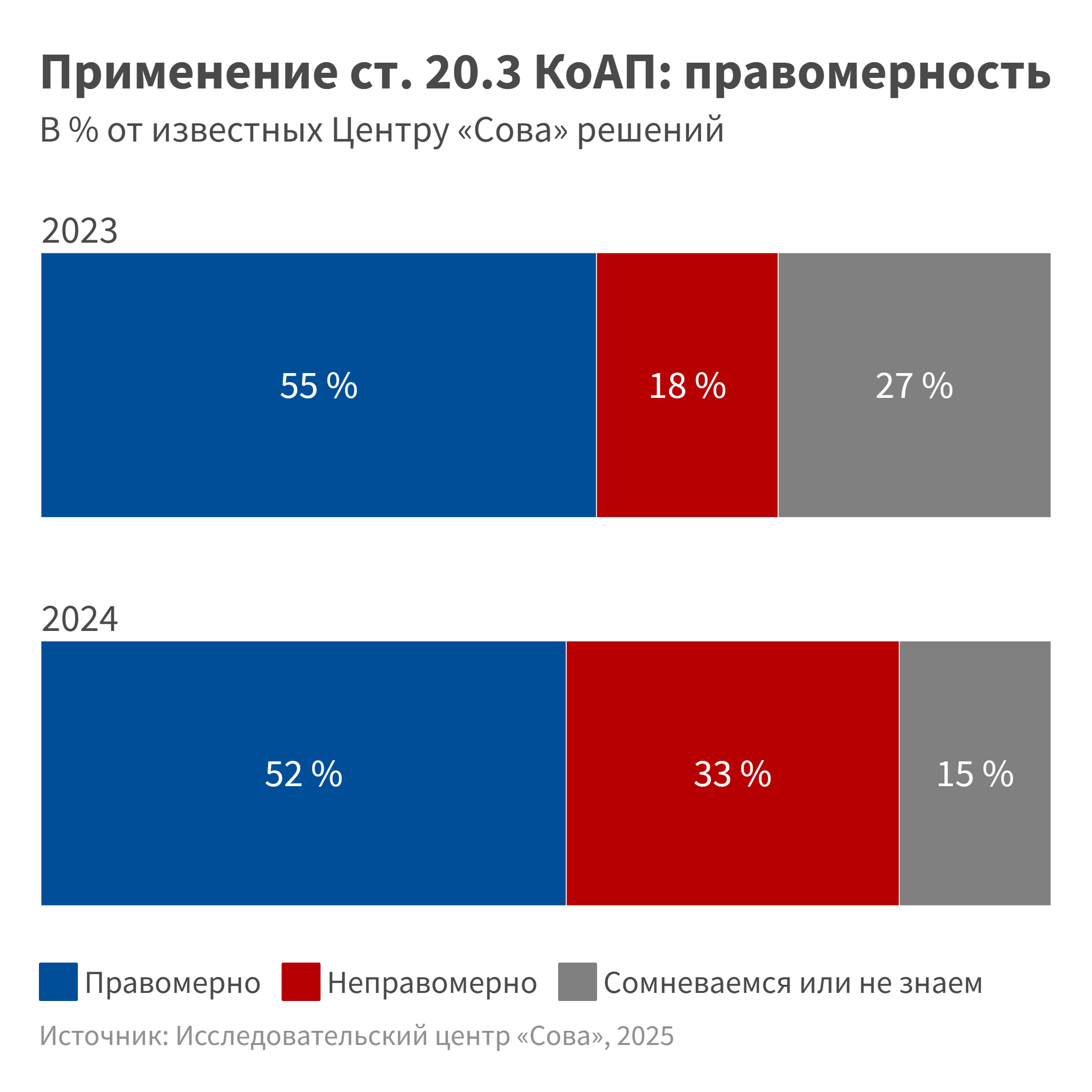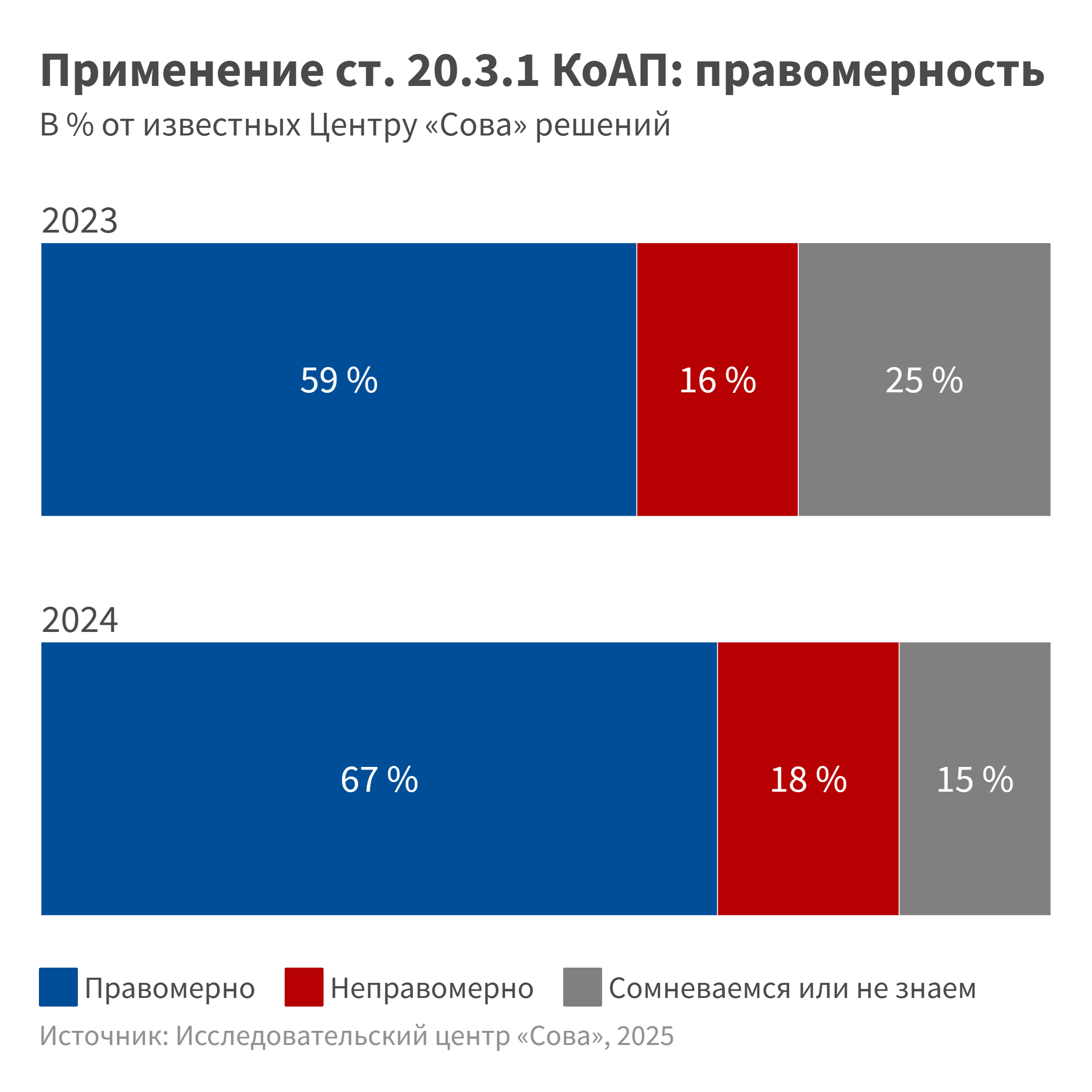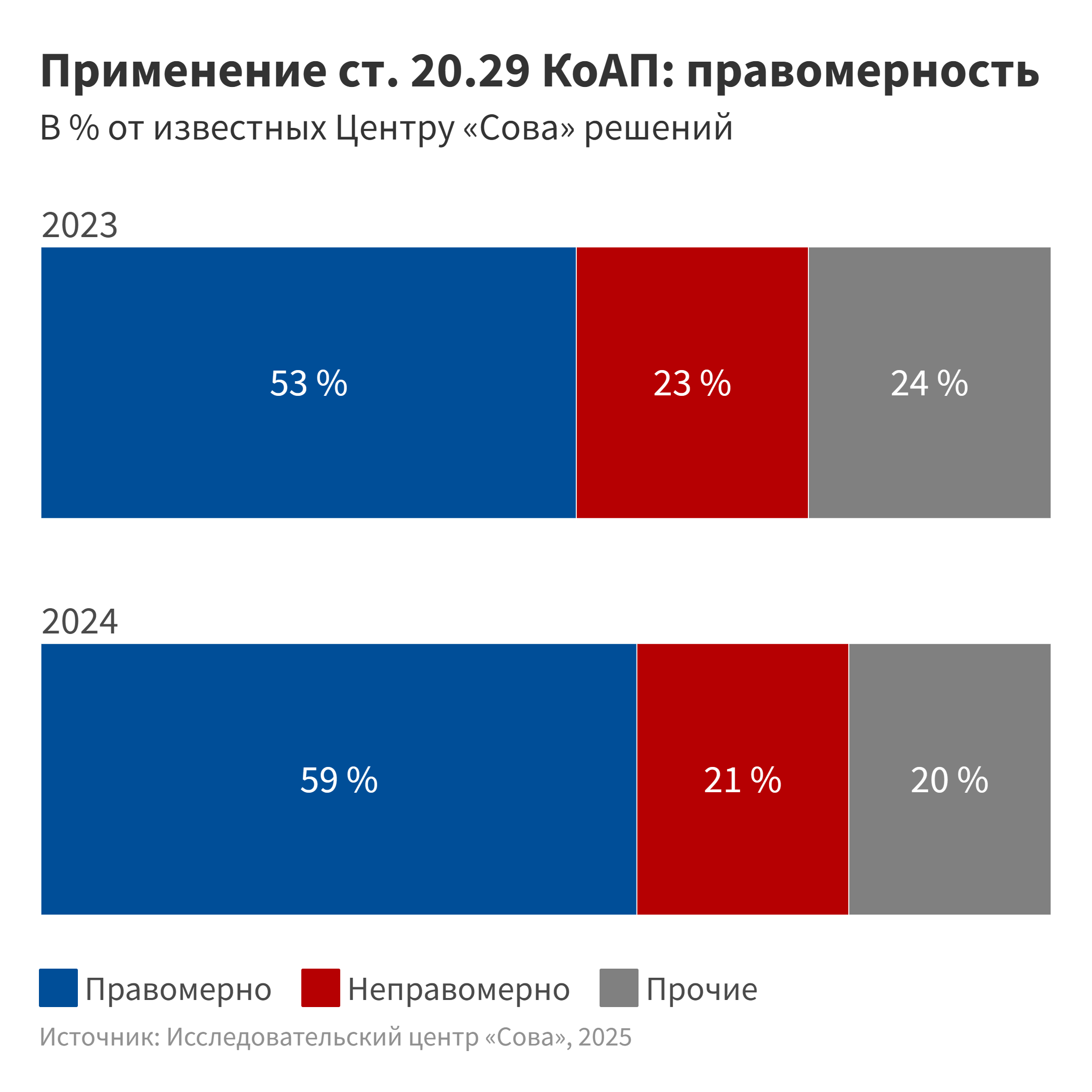 Хотя наша информированность в 2024 году повысилась — мы изучили 650 решений, а годом ранее 390, — картина изменилась несущественно: и в 2023, и в 2024 году примерно две трети решений по административной статье о возбуждении ненависти мы отнесли к обоснованным, не более одной пятой этих решений — к вынесенным неправомерно.