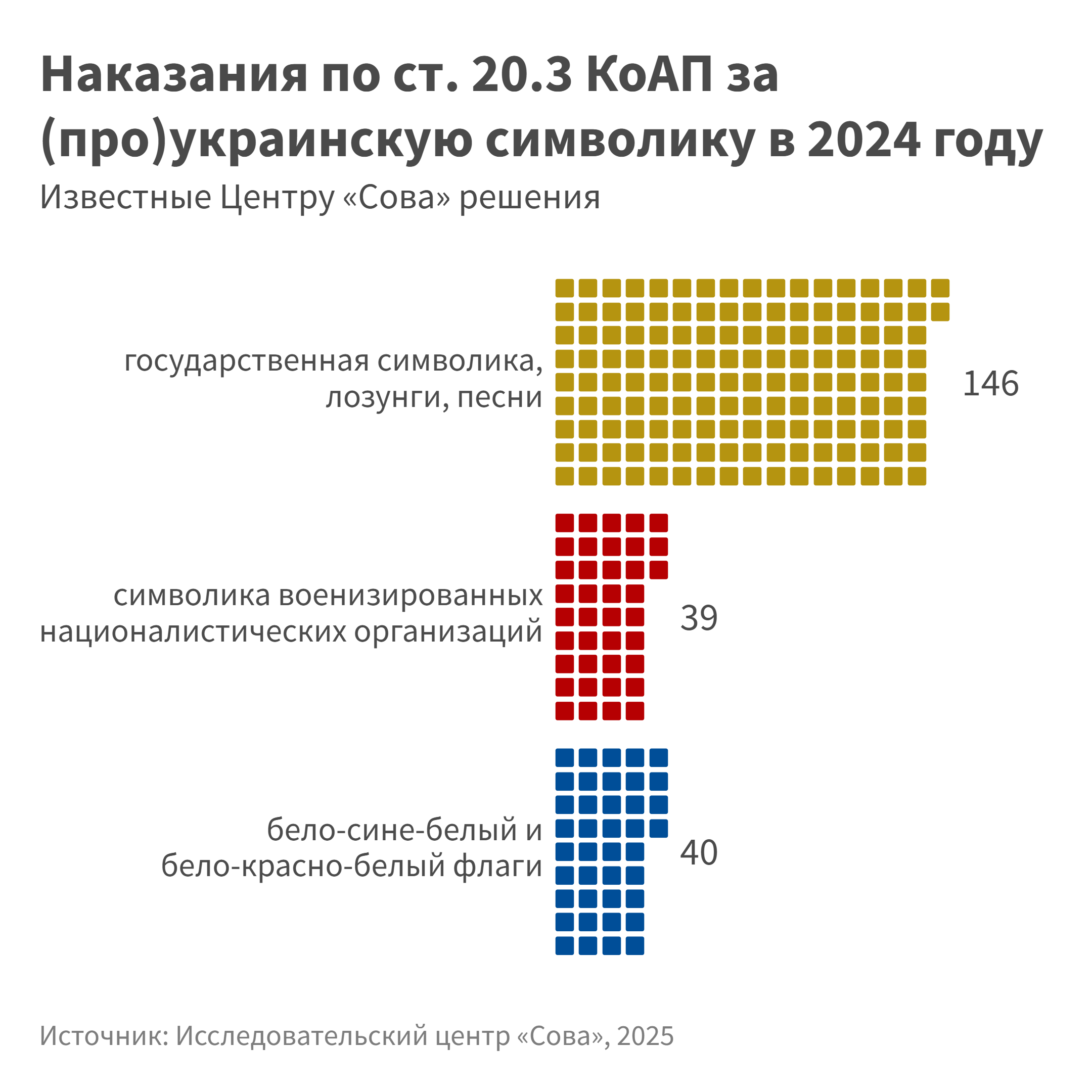 - В 2024 году в 146 (в 2023 — в 42) случаях санкции были наложены за демонстрирование в той или иной форме украинской атрибутики — государственного герба с трезубцем или подобного трезубца самого по себе, флага, лозунга «Слава Украине», а также народной песни «Червона калина» — все это правоохранительные органы и суды трактуют как символику украинских националистических организаций, которые запрещены в России как экстремистские, хотя по сути речь идет об общеупотребительных в Украине атрибутах. Подобные случаи преследования (при отсутствии явно ксенофобного контекста) мы относим к неправомерным.
