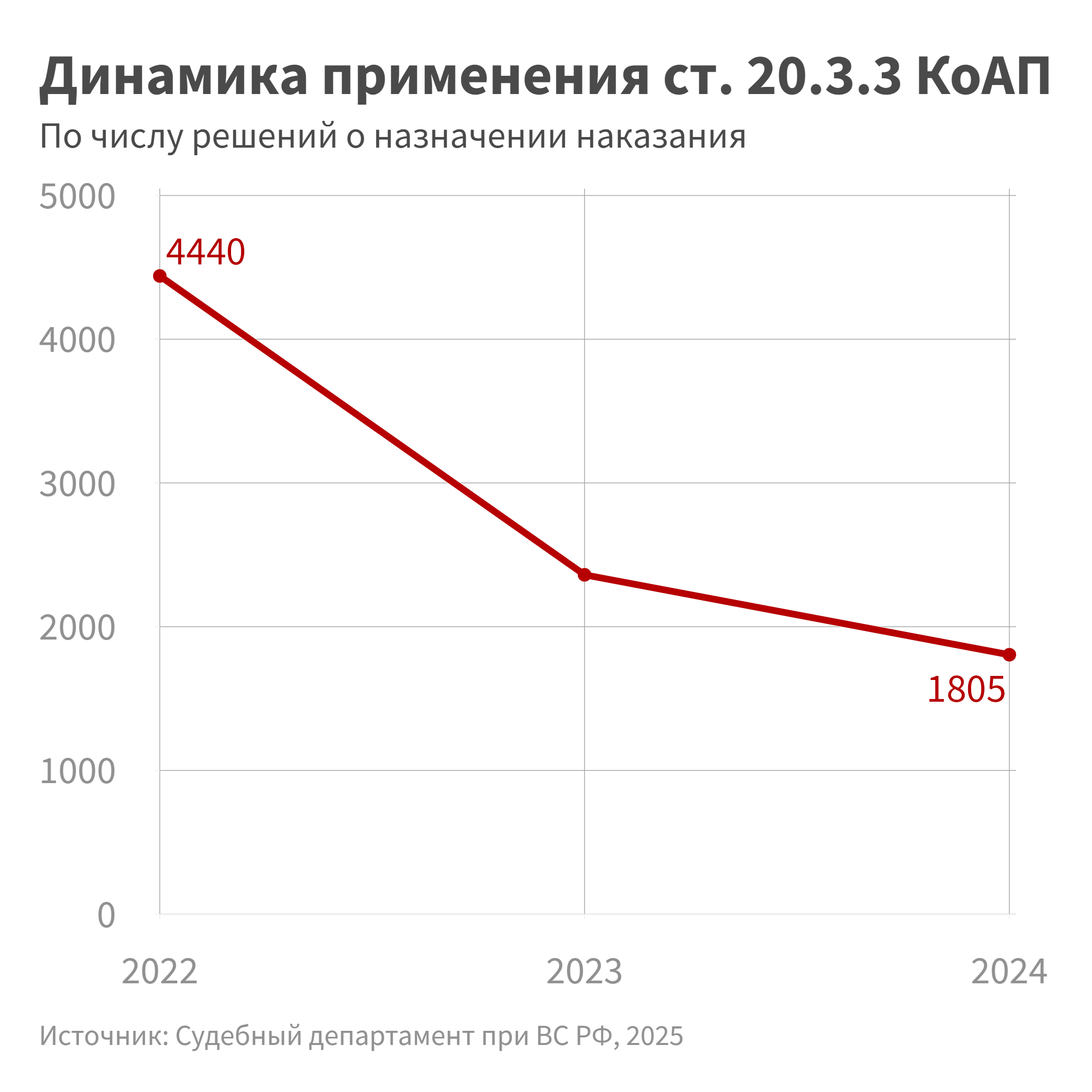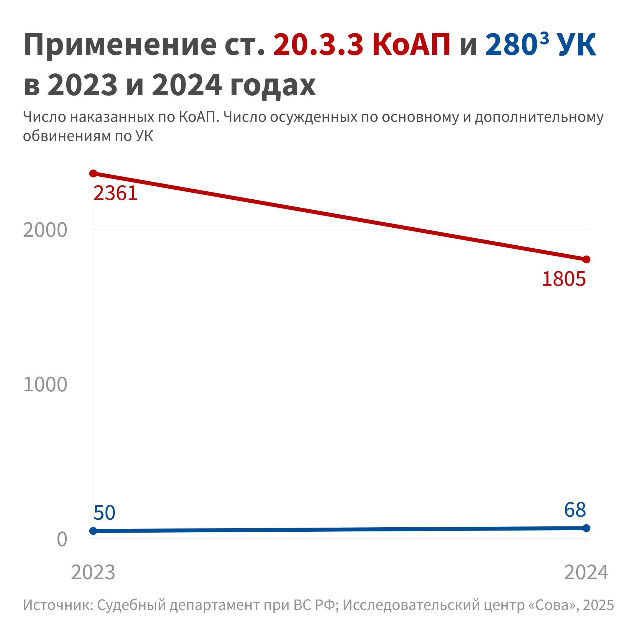 Как показывают данные судебного департамента ВС, число наказанных по ст. 20.3.3 КоАП о дискредитации использования российских вооруженных сил и действий государственных органов за рубежом в 2023 и 2024 годах неуклонно снижалось. Если в 2022 году, когда эта статья была введена в КоАП, наказания назначили 4440 раз, то в 2023-м — 2361 раз (на 47 % меньше), а в 2024 — 1805 (на 24 % меньше, чем в 2023-м). По данным сайтов судов, все эти решениябыли вынесены по ч. 1 этой статьи[10].