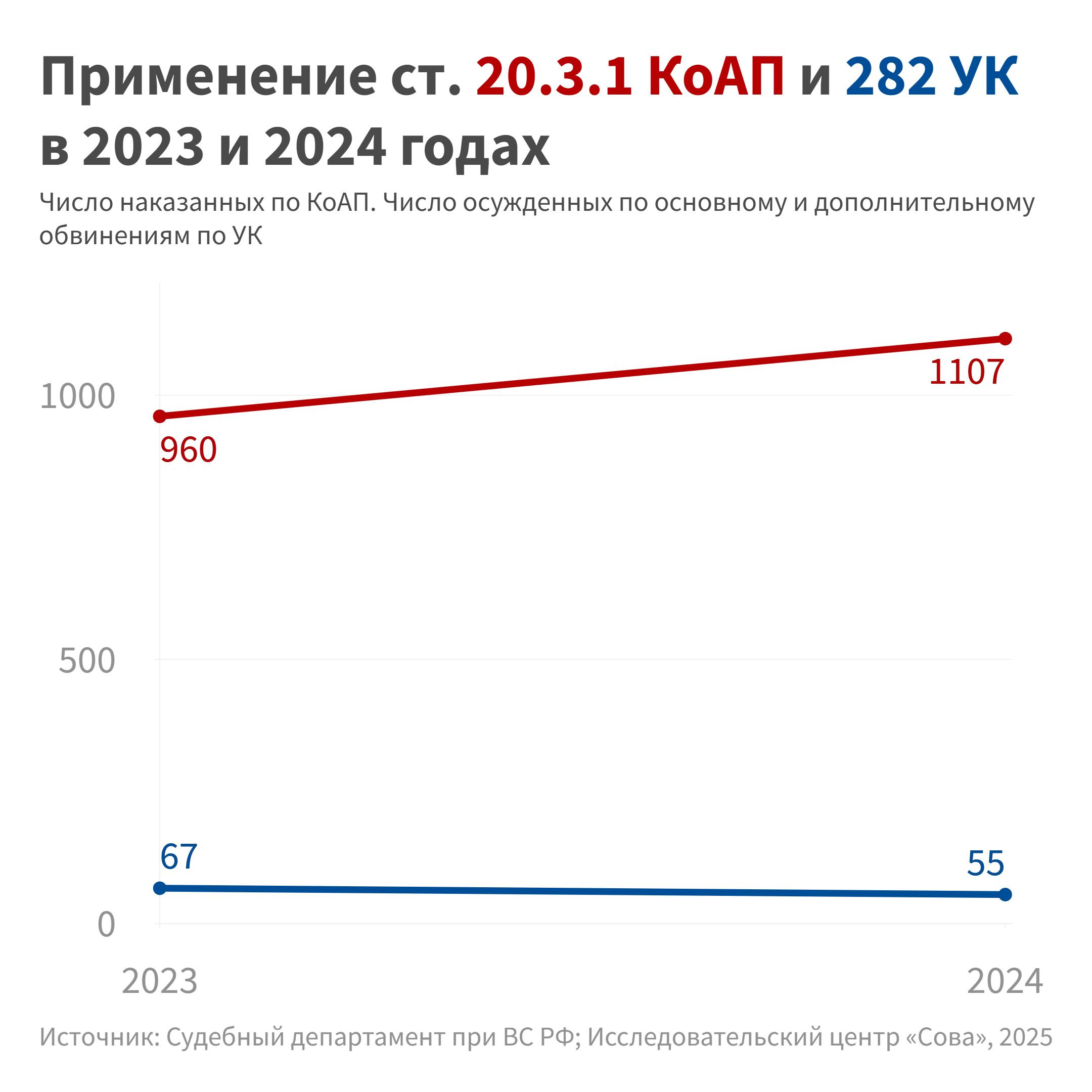 График ниже позволяет сравнить число наказаний по ст. 20.3 КоАП с числом приговоров по ст. 2824 УК за повторное демонстрирование запрещенной символики.