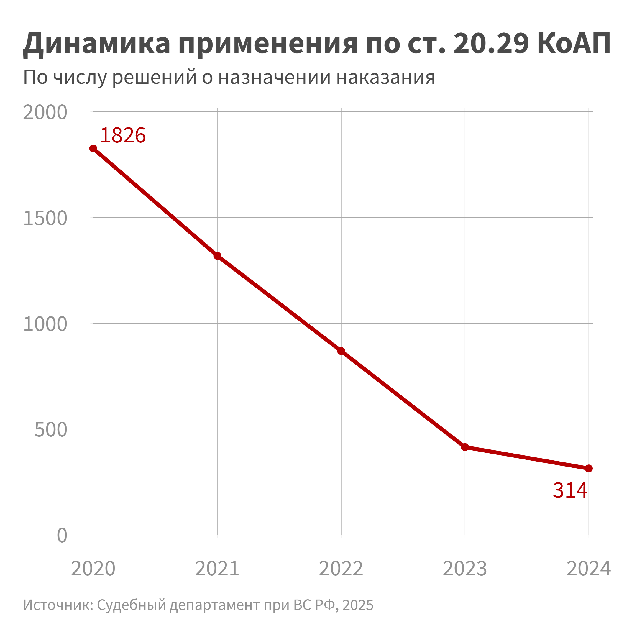 В 2023 и 2024 годах число санкций по ст. 20.29 КоАП о массовом распространении экстремистских материалов продолжило снижаться, пусть это снижение и стало более плавным.