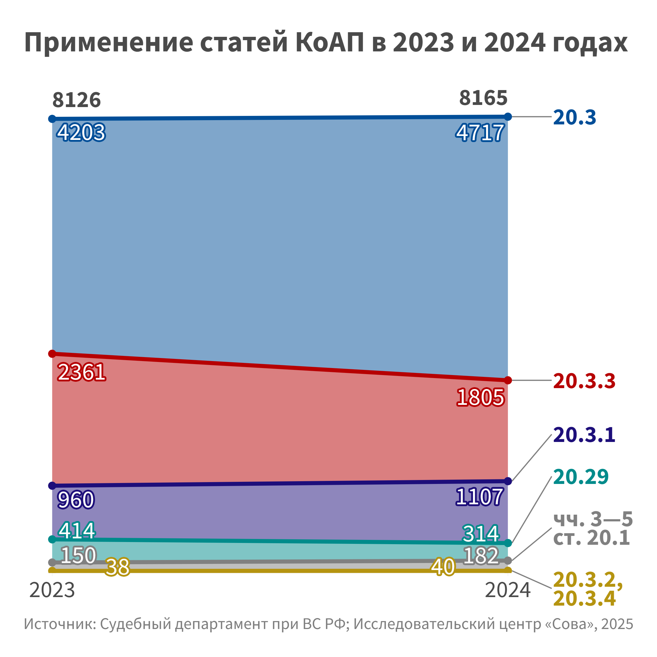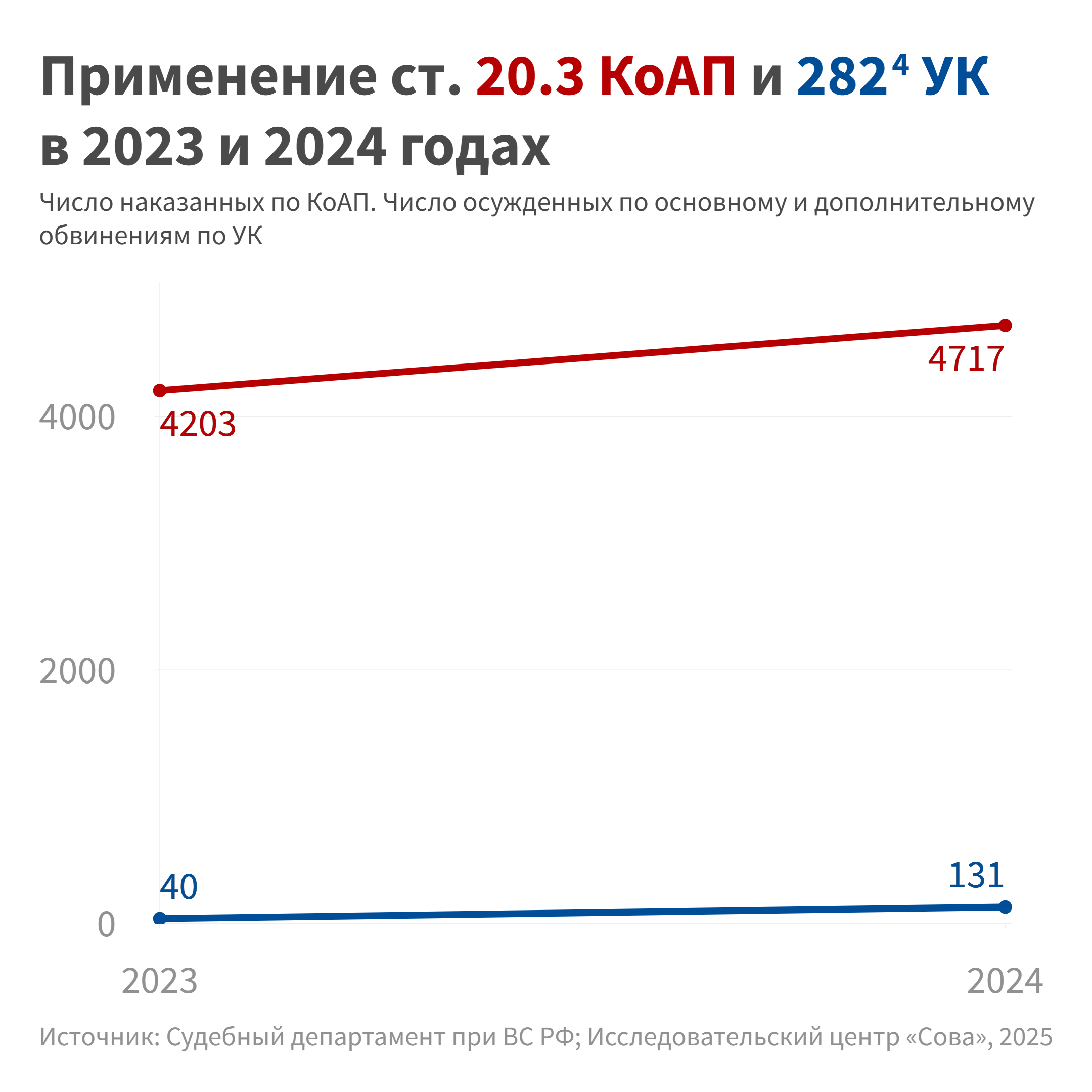 По ст. 20.3 КоАП об использовании запрещенной символики в 2023 году наказание было назначено, по нашим подсчетам,4203 раза, а в 2024 году — 4717 раз, таким образом прирост составил 12 %.