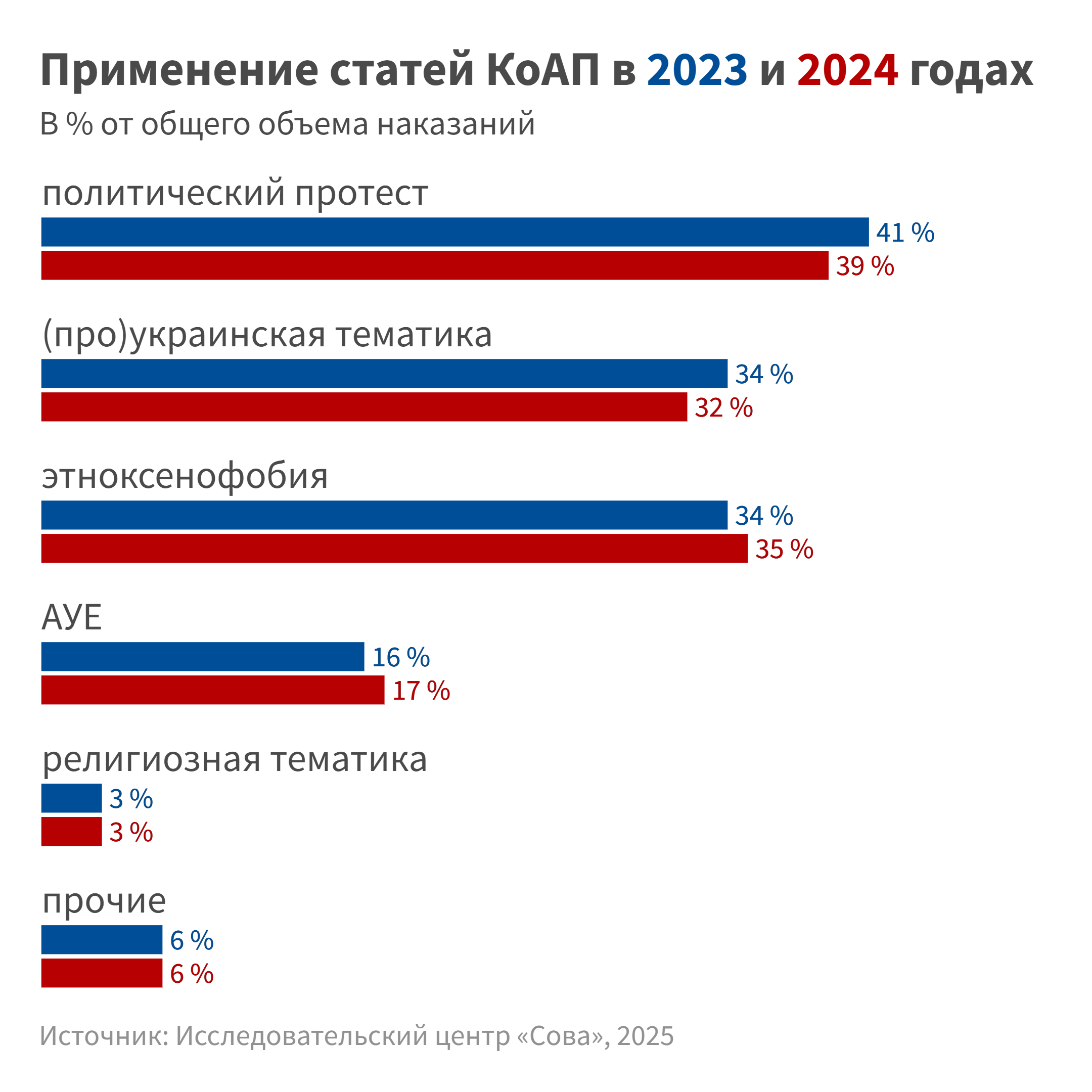 - Дела о высказываниях, связанных с событиями в Украине, и демонстрировании украинской символики: в 2023 году 34 %, в 2024 — 32 %.