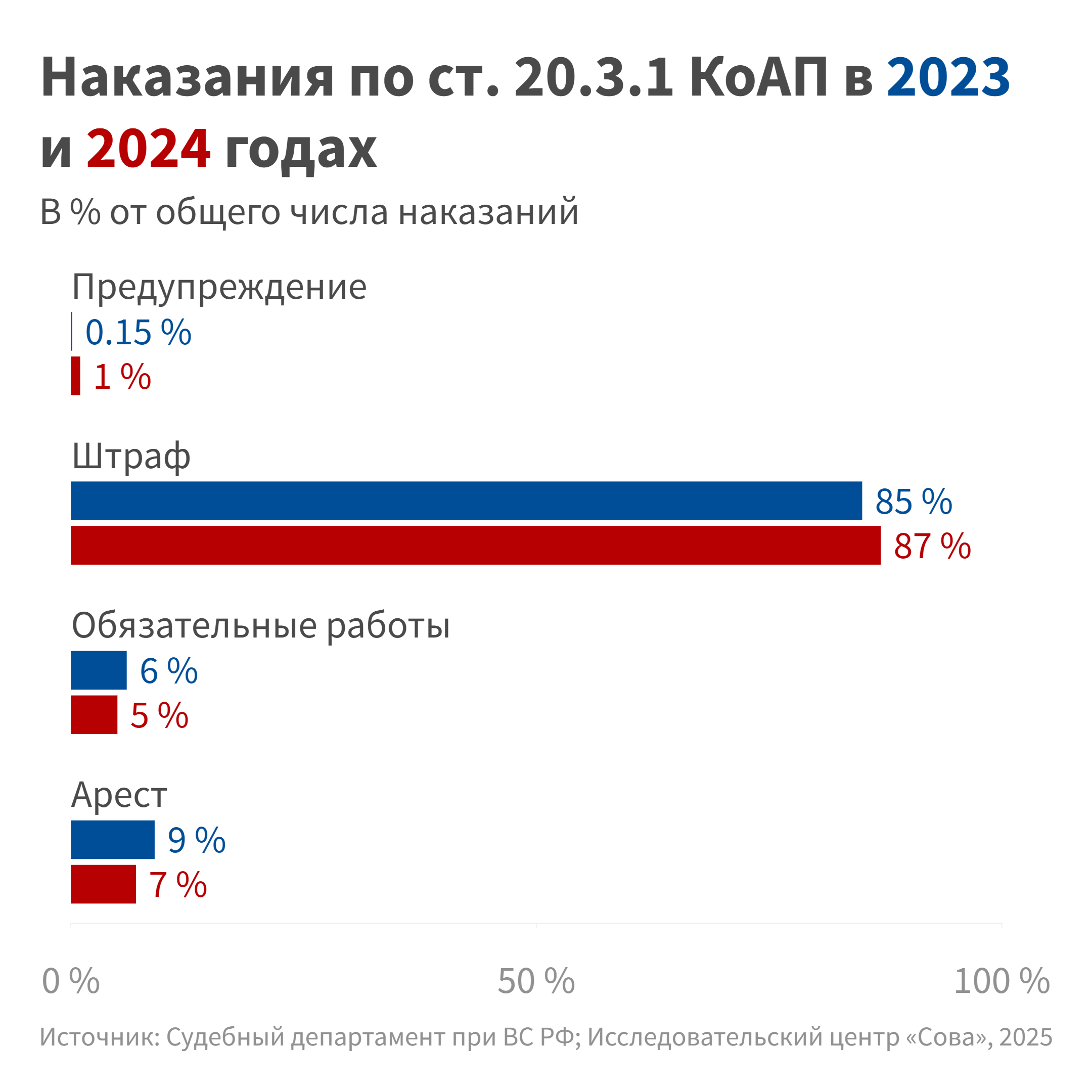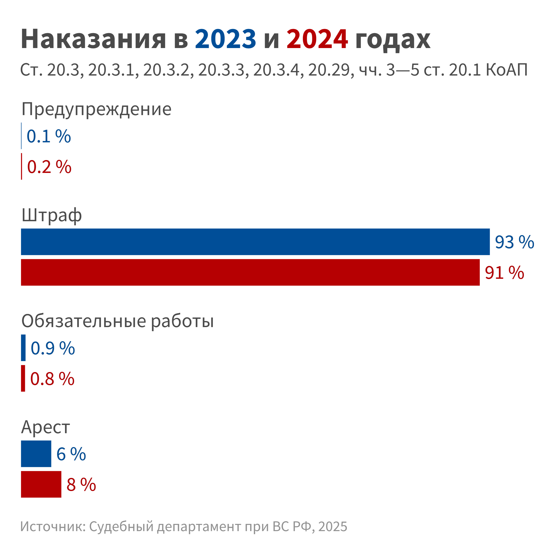 По подсчетам, основанным на данных судебного департамента ВС и наших собственных данных, в 2023 году примерно в 91 % случаев был назначен штраф, в 9 % — административный арест, в 2024 году в 87 % случаев назначался штраф, в 13 % — арест, предупреждения оба года суды выносили однократно.