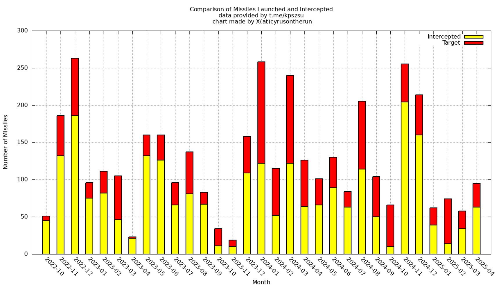 OSINT-исследователь Cyrus проанализировал статистику Воздушных сил ВСУ относительно противодействия российским ракетным ударам. По его оценке, за первые четыре месяца 2025 года общее количество российских ракетных ударов уменьшилось. Основным применяемым типом стали баллистические ракеты «Искандер-М». Значительно сократились пуски авиационных ракет Х-101, Х-59/Х-69 и ЗУР С-300/С-400 по наземным целям.