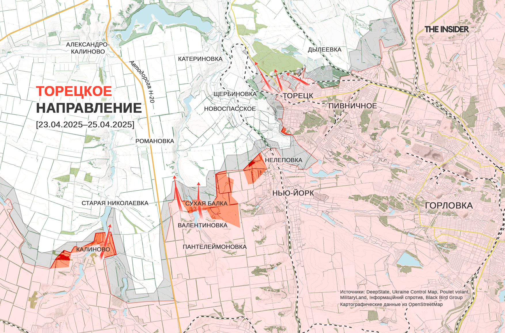 DeepState отмечает захват российскими военными Калинова, о чем Минобороны РФ сообщало 16 апреля. «Военкор» Юрий Котенок пишет о наступлении с обоих флангов «кармана» вдоль трассы Н-20, и прогнозирует скорое возникновение угрозы для путей снабжения и эвакуации украинских войск из района Щербиновки и Торецка. Он также заявляет о штурмах позиций ВСУ севернее Торецка по направлению к селу Дылеевка.