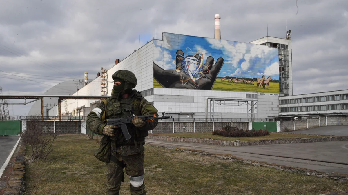 Российский военнослужащий на фоне Чернобыльской АЭС, 24 марта 2022 года. Фото: Picvario Media, LLC / Alamy / Vida Press