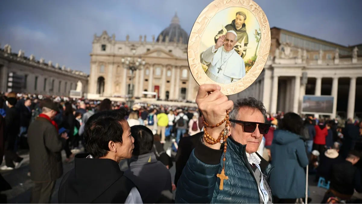 Мужчина держит портрет покойного Понтифика перед началом похорон на площади Святого Петра, Ватикан, 26 апреля 2025 года. Фото: Massimo Percossi / EPA-EFE