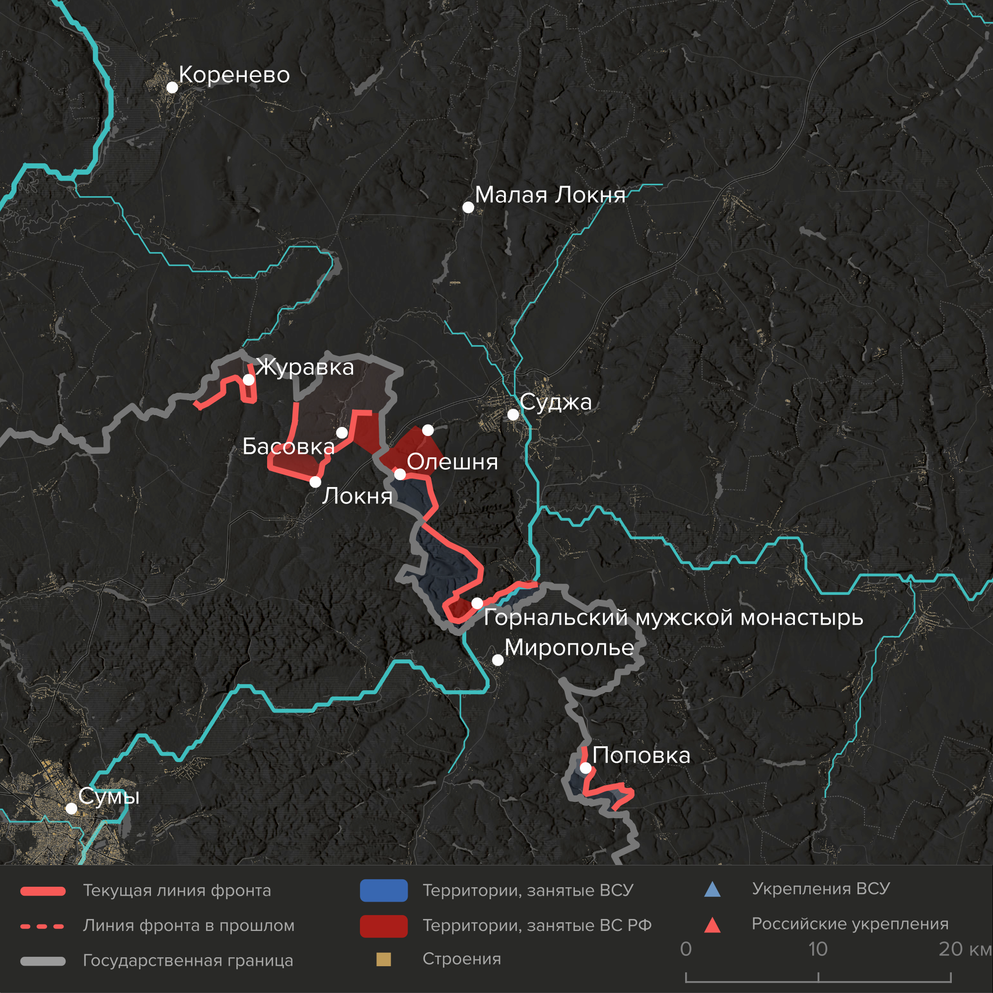 - Наступление ведется с трех сторон: от захваченной ВС РФ Басовки (там продолжаются тяжелые бои за маленькое село Локня), от границы вдоль дороги Суджа—Сумы и с северо-запада — со стороны занятого российской армией села Журавка.