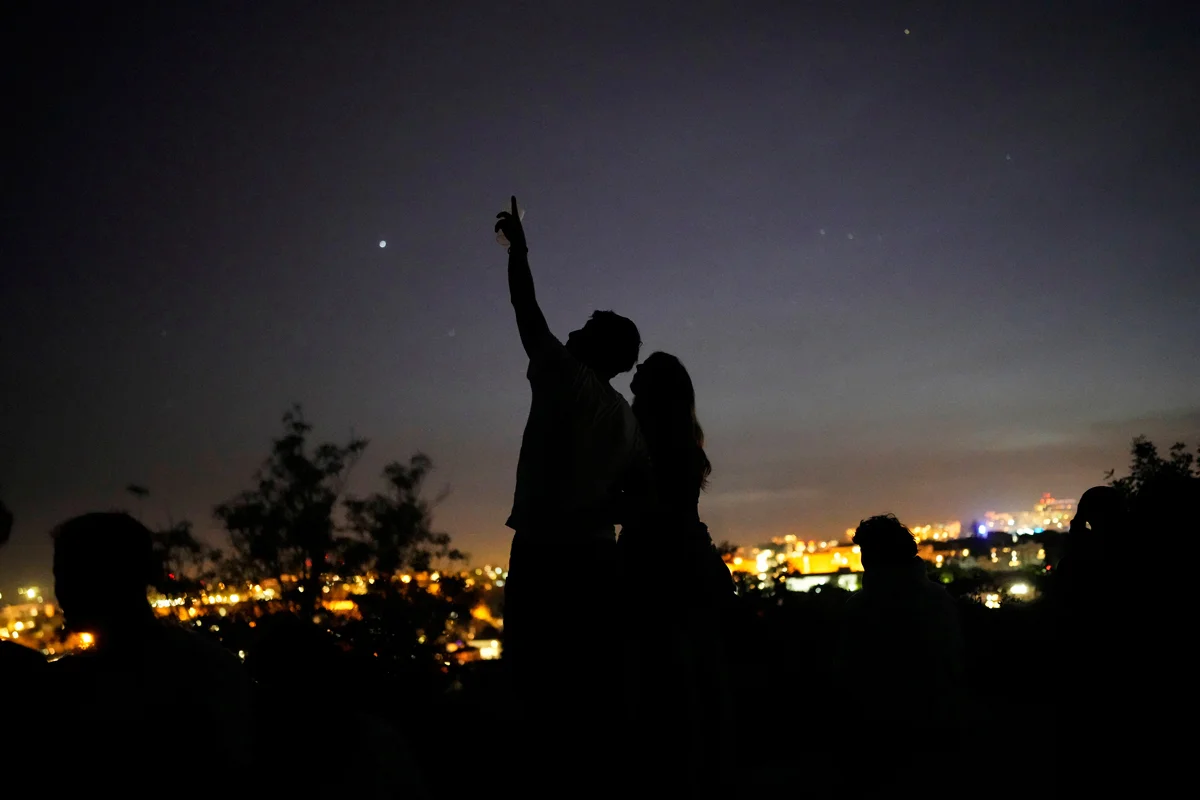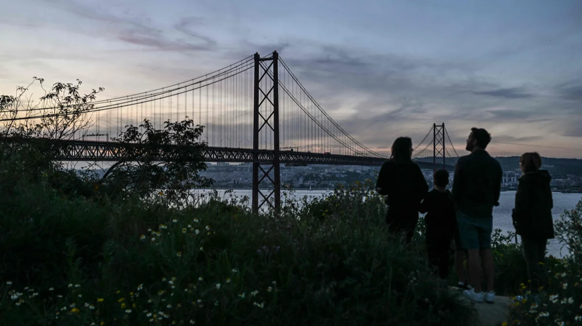 Семья наблюдает за мостом 25 апреля с выключенной подсветкой во время масштабного отключения электроэнергии, Лиссабон, 28 апреля 2025 года. Фото: Patricia de Melo Moreira / AFP / Scanpix / LETA