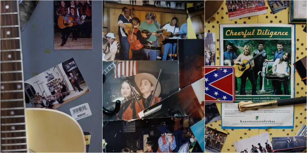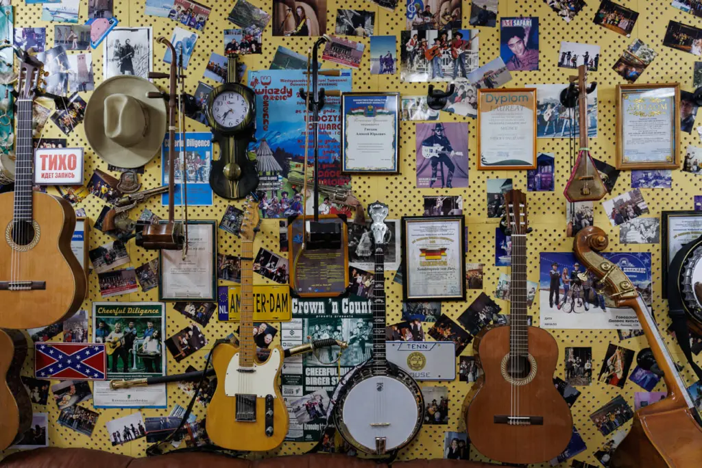 Жёлтые стены небольшого кабинета плотно увешаны фотографиями, дипломами, ковбойскими шляпами и пистолетами из фильмов про Дикий Запад, афишами выступлений за рубежом на шведском, польском и английском языках и музыкальными инструментами. Здесь гитары, китайские скрипки, мандолины и банджо, напоминающее бубен с грифом и струнами. В углу стоят барабаны, у стены — контрабас.