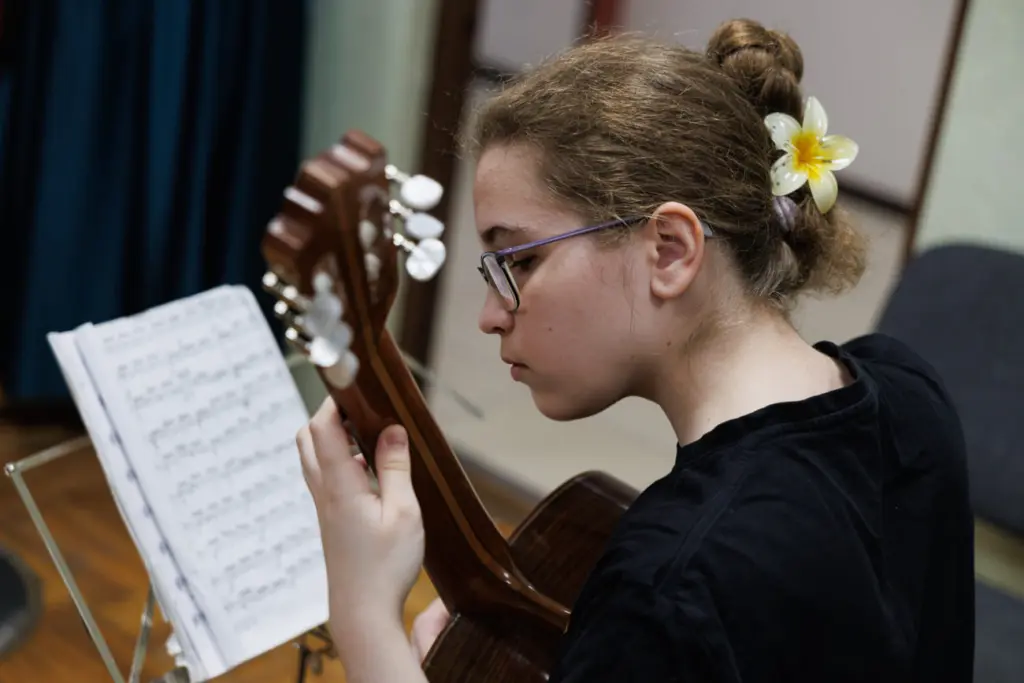Ане скоро исполнится двадцать, она учится в Калуге на биолога, а на выходные приезжает домой в Обнинск и приходит на репетиции, чтобы поиграть на скрипке и мандолине.