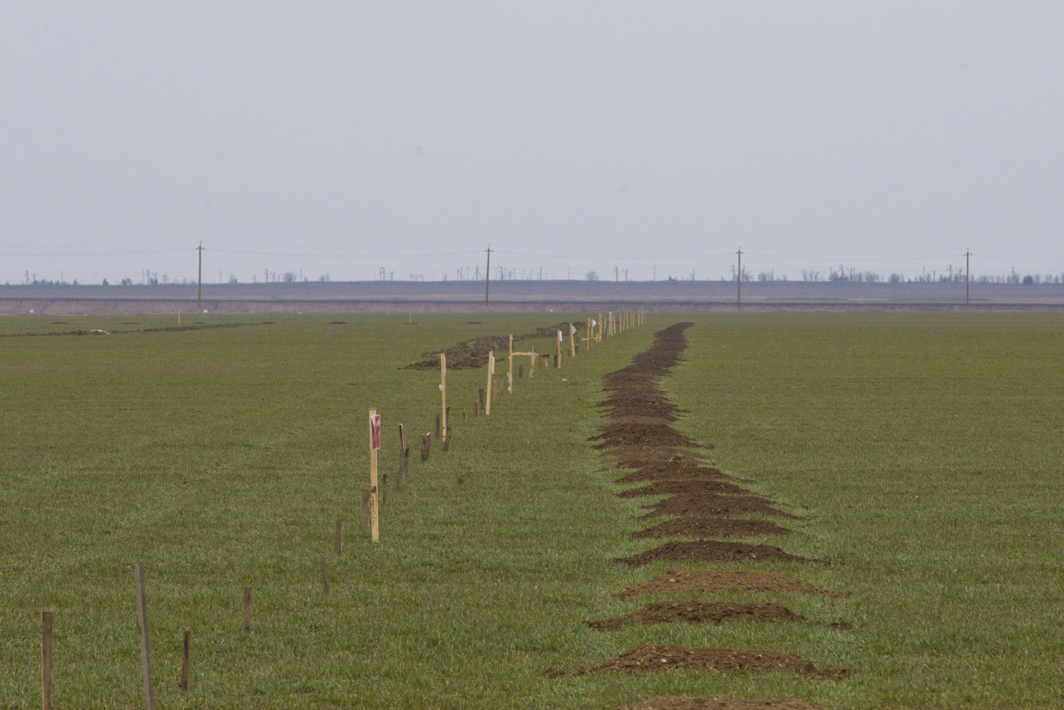 Смотрю, что по лагерю ходят омоновцы из «Беркута», вот в этом синем камуфляже с надписью «Милиция» по-украински. То есть это те самые люди, которые месяцем ранее были на Майдане. Там, на Майдане, один раз мне шумовой гранатой в лицо выстрелили, поэтому в голове вспыхивает история наших с этими людьми длинных отношений. И они даже не то чтобы пугают меня, скорее рисуются — кто-то затвором перещелкивает, когда мимо прохожу. В общем, они проводят мне этот тур, что-то я снимаю, что они разрешают. Удивительно, что при этом блокпост был похож на лагерь на Майдане. Явно насмотрелись технологий, костры в бочках — это было абсолютным продолжением Майдана. Возвращаемся на блокпост, я говорю: «Спасибо, ладно, я пойду, а что это у вас поле перекопано?» Они отвечают: «А мы там мины устанавливаем». Я говорю: «Можно снять?», они говорят: «Нет, нельзя». А вот эта полоска ямок в поле была не на уровне блокпоста, а примерно на 30 метров в сторону континентальной Украины от него. Как раз в ту сторону, куда мне и надо идти.