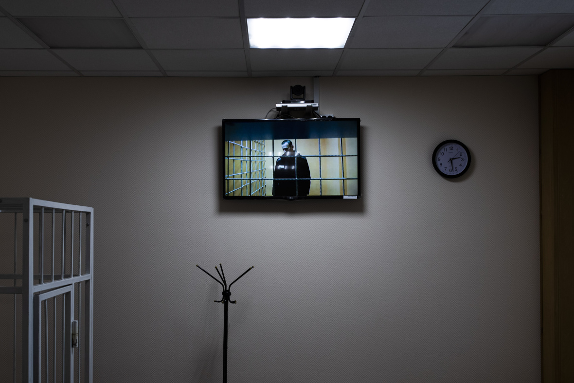 Алексей Навальный на экране в суде. Петушинский районный суд, 28 декабря 2021 года