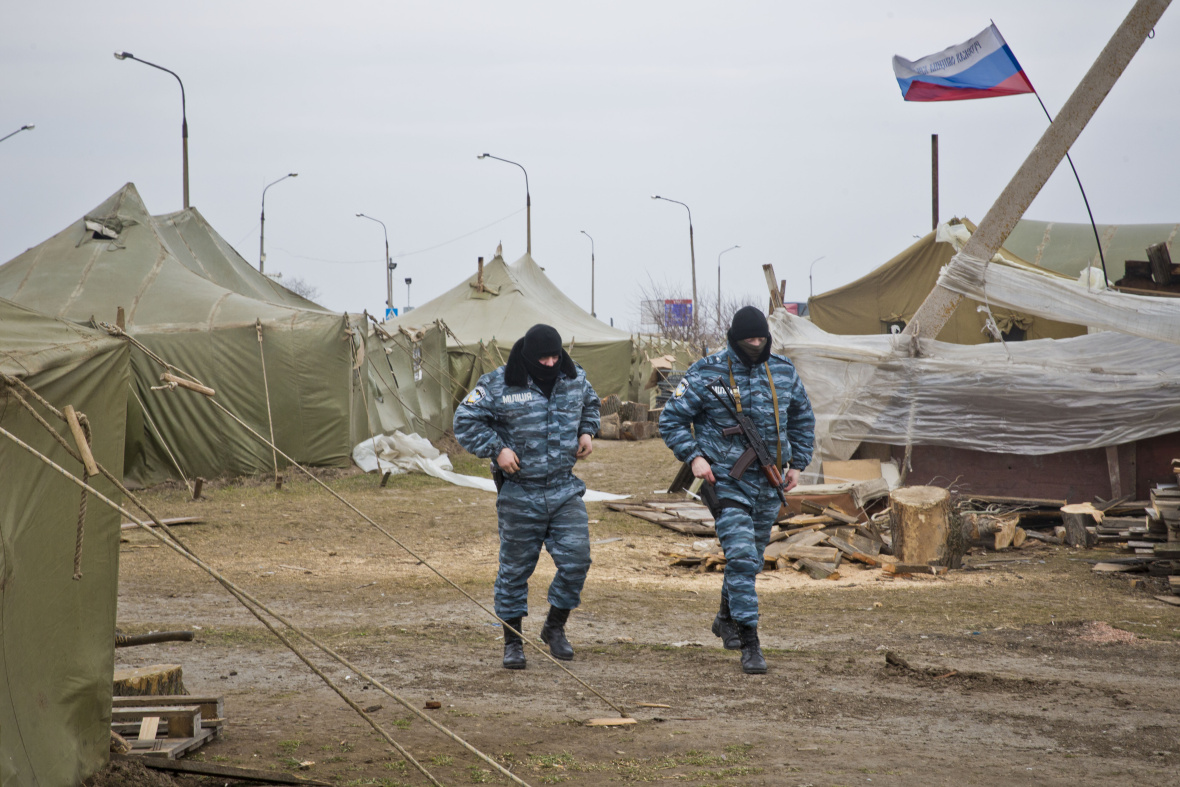 Лагерь у блокпоста, разбитый российскими вооруженными силами и их союзниками. Чонгар, 8 марта 2014 года