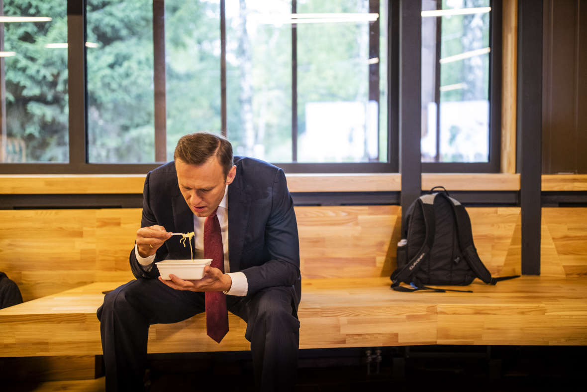У меня вот этого первого фильтра не было вообще. В моем процессе просто не было точки, где я бы задумывался о том, как политически какие-то кадры будут выглядеть для Навального. Я делал документальный проект, документальный до мозга костей. На самом деле я думаю, что ставка Навального сыграла. Я уверен, что, например, фотографию с дошираком — наверное, самую известную из всей той работы — я бы не снял, если бы заботился о том, как он выглядит. Я ее сделал в кулуарах съезда сотрудников региональных штабов. И с официальной точки зрения на этой фотографии он выглядит не очень выгодно — сидит человек в костюме и жадно ест лапшу какую-то нелепую.